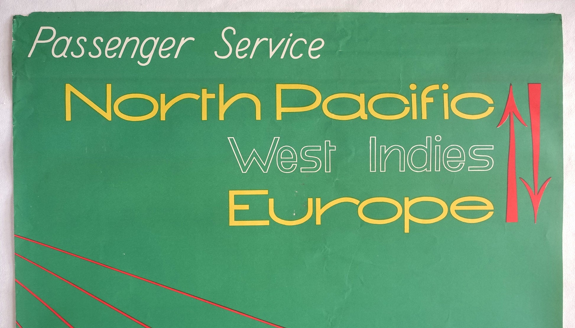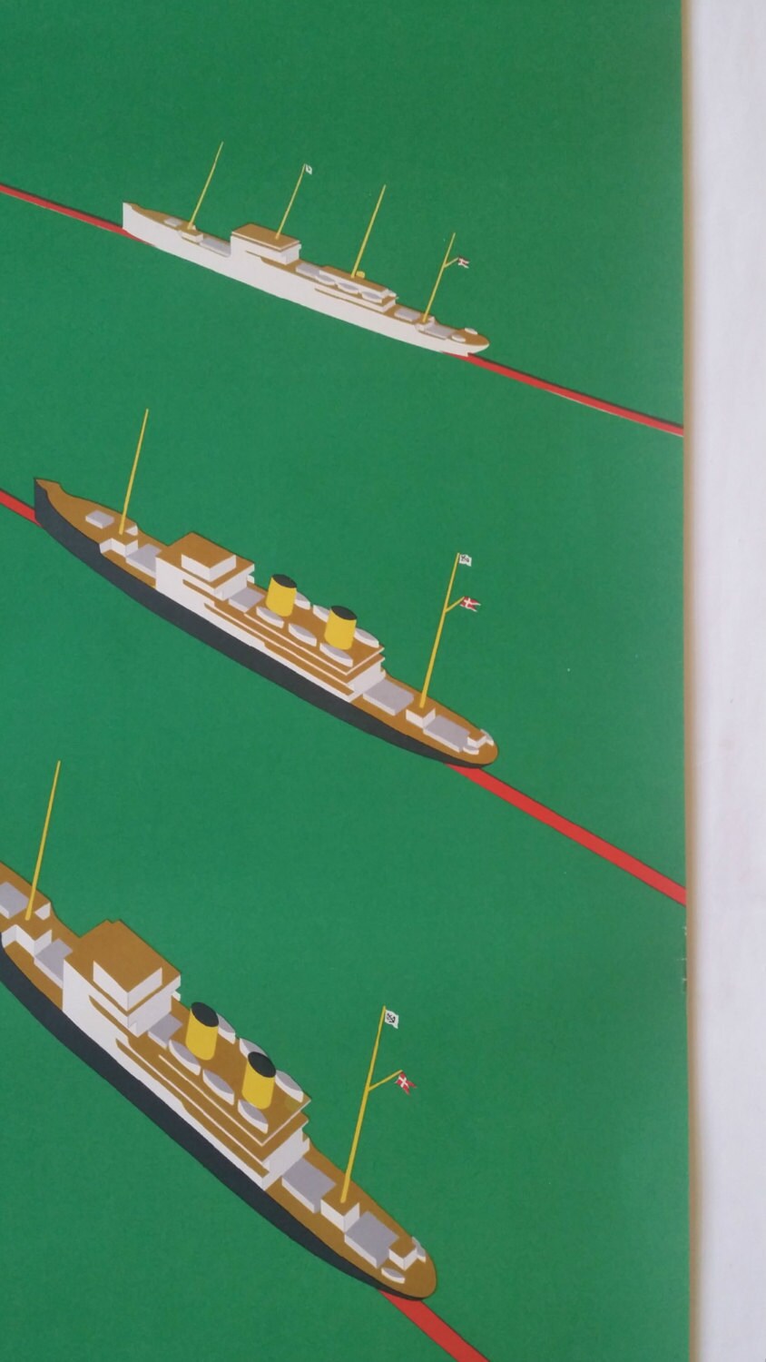 This beautiful art deco advertisement poster from The East Asiatic Company portraying four passengers ships sailing in a perfect diagonal from different directions.