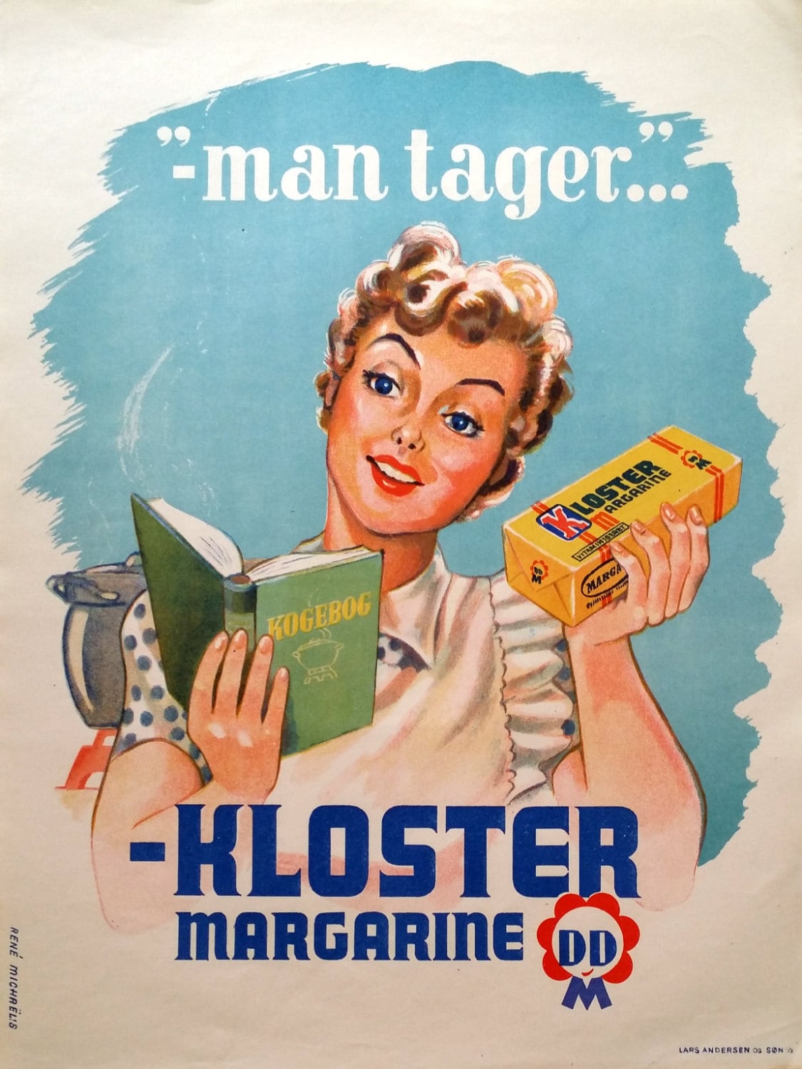 This is a great mid-century advertisement featuring a scene from the 1950s kitchen with a young woman reading a cookbook. The headliner of the poster "- man tager.." ( -first you take..) is a classical starter for a recipe and while the woman is holding a nice package of Kloster Margarine makes it easy to figure the margarine is a central ingredient in her recipe.