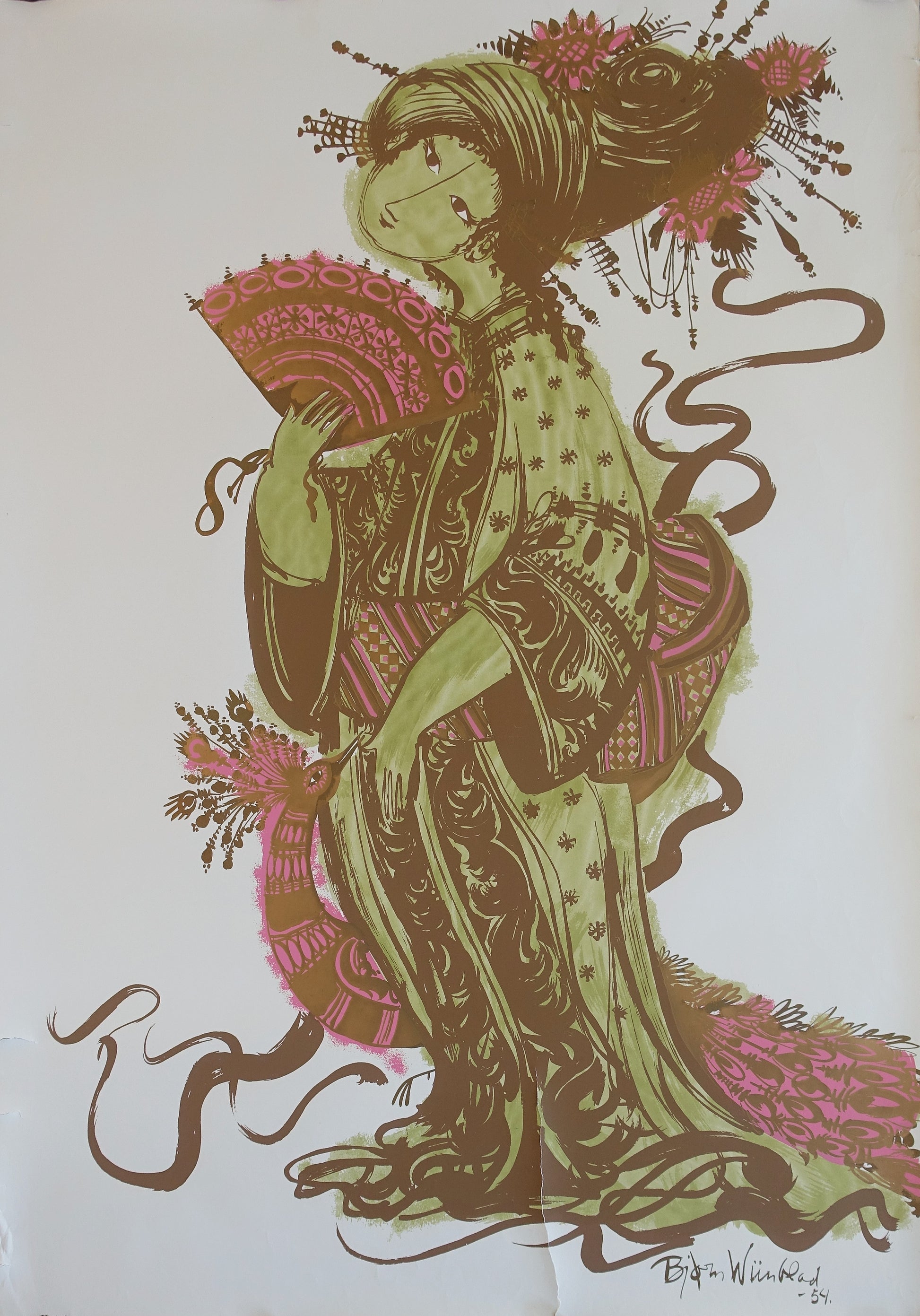 One of the greatest works by Wiinblad displaying a beautiful young geisha with her cute peacock.