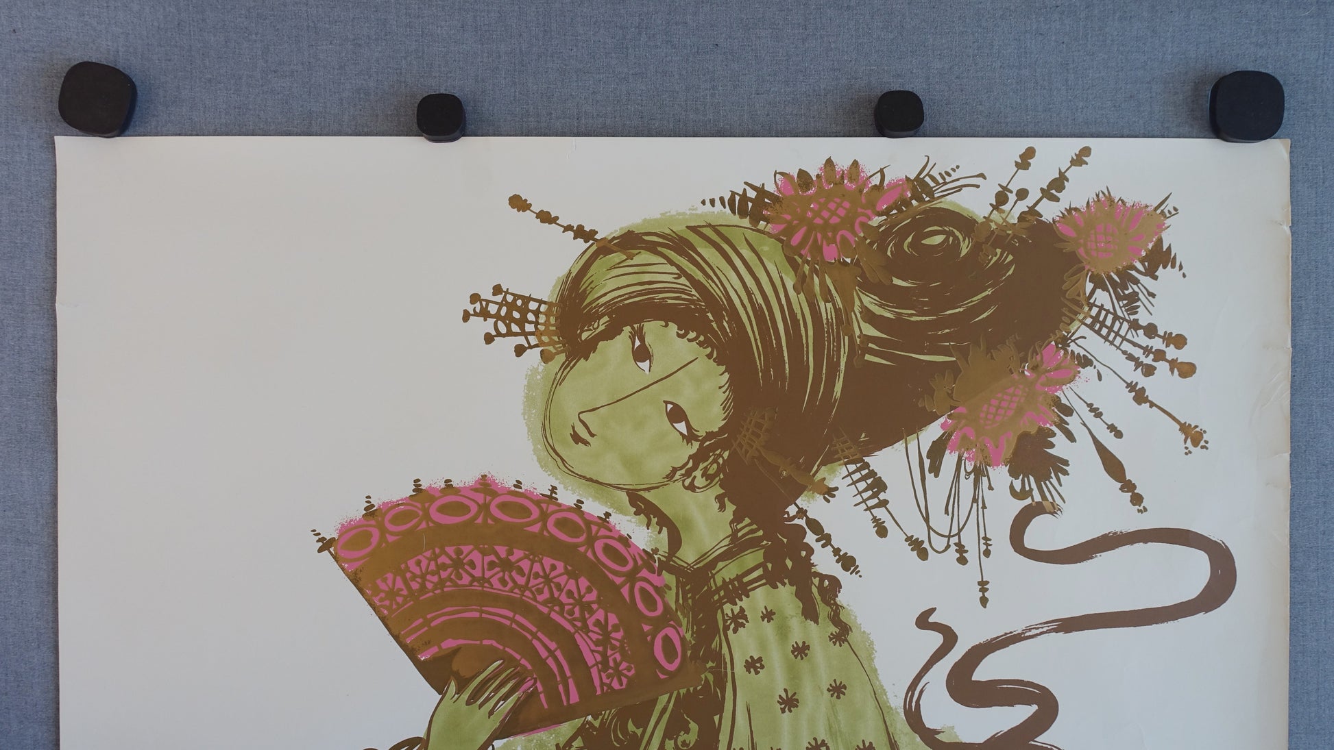You are looking at one of Wiinblad's younger works from 1954 - a theater poster from "Det Ny Teater" (The New Theater) in Copenhagen. The poster advertises the play "The Teahouse of the August Moon" (the Danish title "Det Lille Thehus") and displays the young geisha, Lotus Blossom. She will later get the tea house which is mentioned in the title of the play.