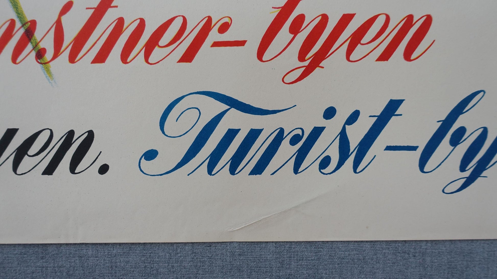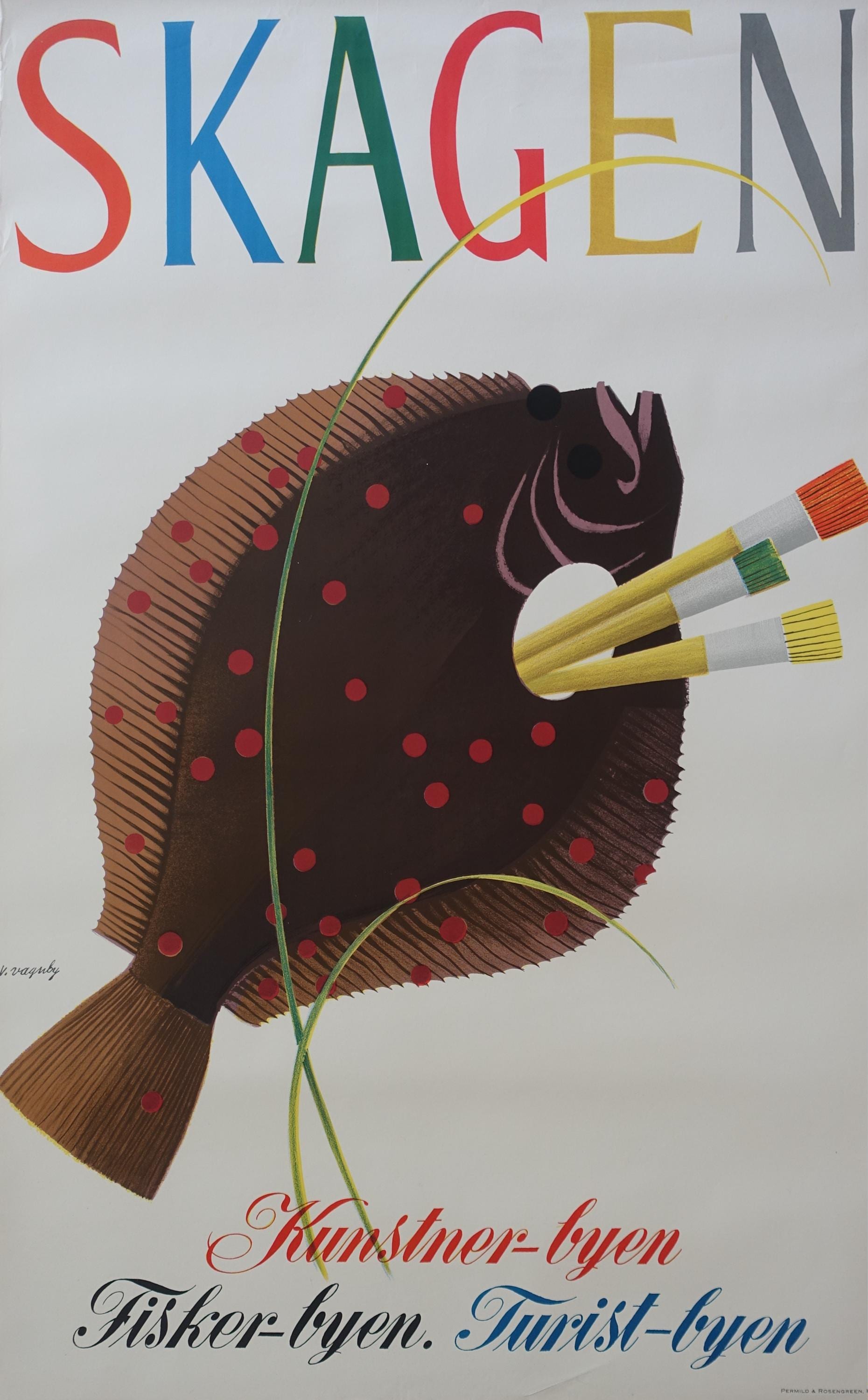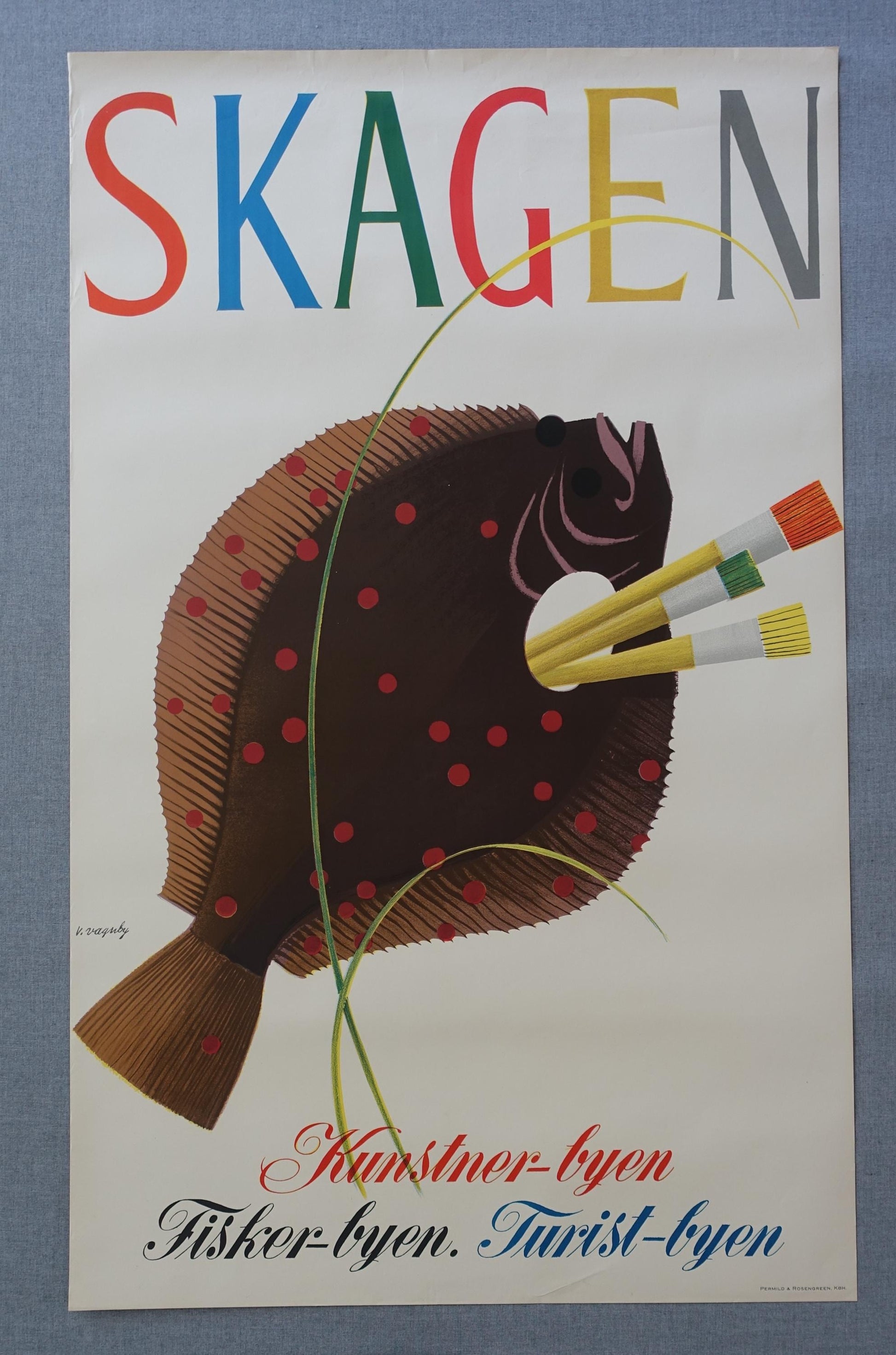 The poster artist is Viggo Vagnby (1896-1966) - a Danish cartoonist and poster artist who originally debuted as a cubist painter. He further trained in drawing in France in the 1920s and started his own firm to work with advertising images and exhibition architect in Denmark. He made several famous tourist posters like the "Skagen poster" from 1955 depicting a plaice like a painter's palette. Vagnby's most famous poster is the poster "Wonderful Copenhagen" from 1953. This iconic tourist poster shows a traffic constable who stopped pedestrians, cyclists, cars and trams on a Copenhagen street to let a little family of duck undisturbed across the street.
