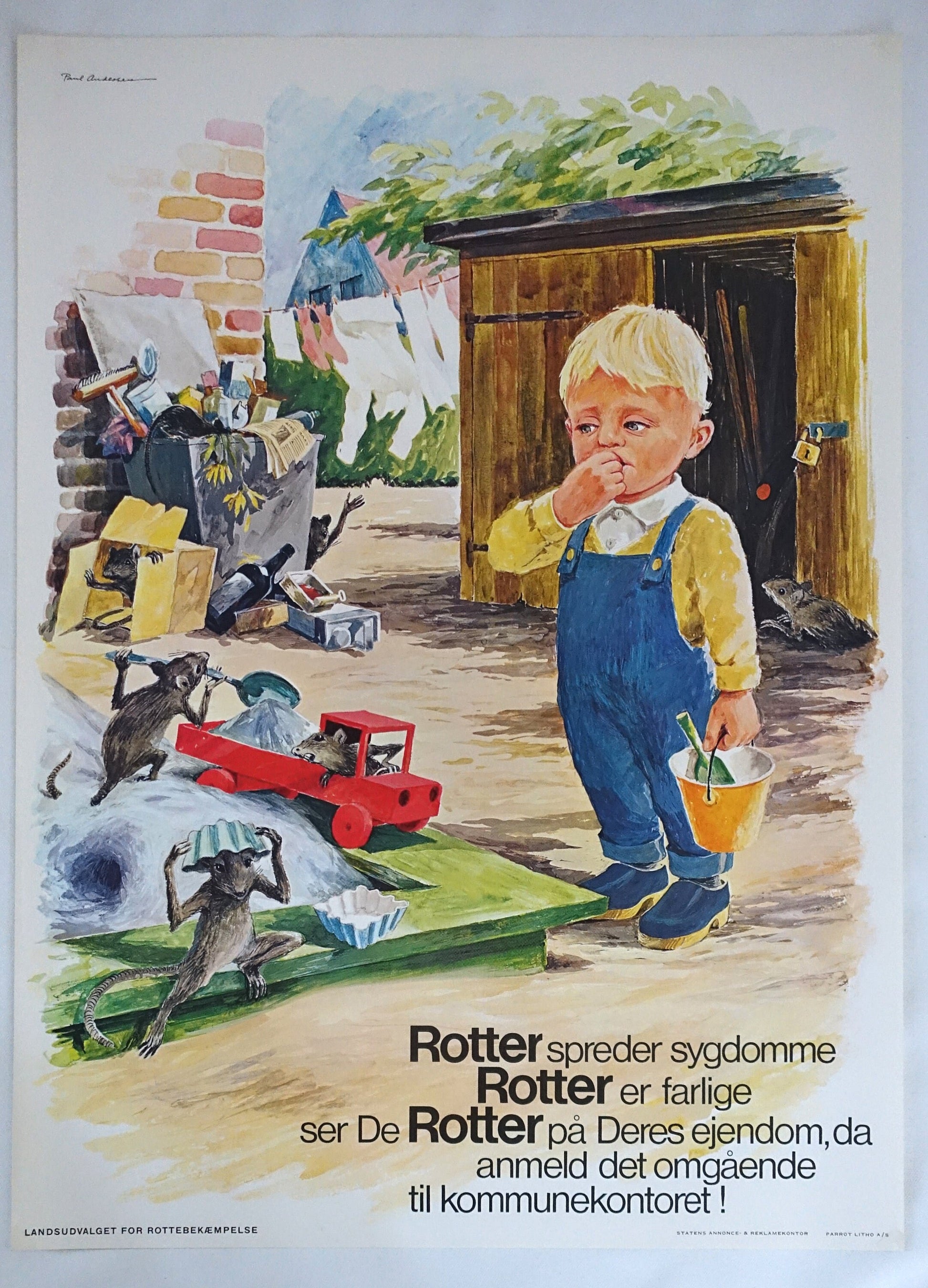 The poster has a message to the people saying (in Danish): "Rats spread diseases. Rats are dangerous. You see rats on your property, then report it to an official office - immediately!".