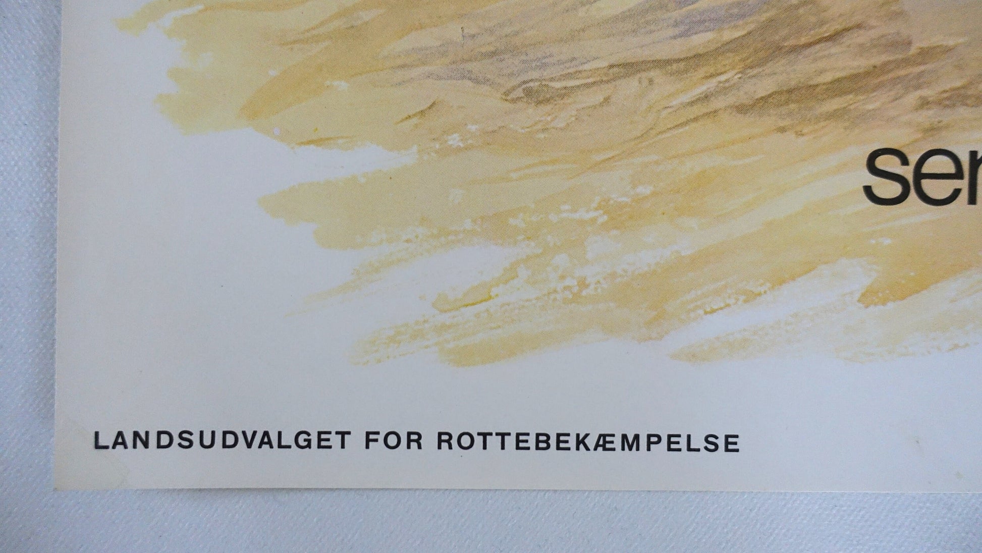 With the adoption of the so called "Rat Act of 1938" in Denmark, the combat against rats by local authorities was systematized. In 1940/41 a new alternative poison to control rats was approved - chopped and boiled onions added smoked herring and flour. The poison had to mixed in the right quantities and chopped in a specific and certain ratio before it had any effect. Then the poison was packed in portions and ready for use. Making the poison required quite a lot of working hours and was thus very costly so that method of making poison was abandoned again. Then the government began to make a national poster campaign which is how this poster was born.