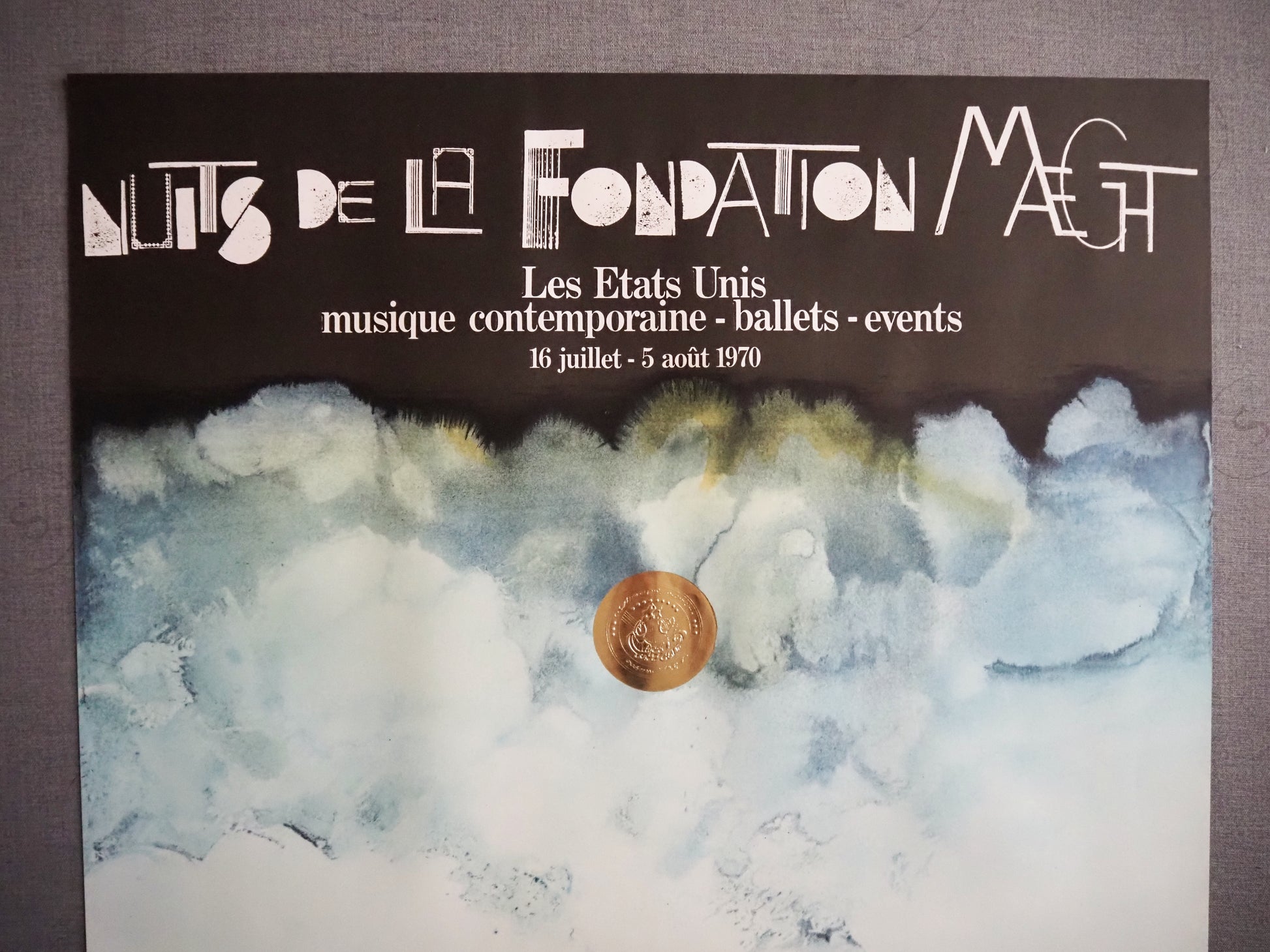 Special and highly collectible original 1970 Fondation Maeght poster, created for the legendary summer event “Nuits de la Fondation Maeght – Les États-Unis: musique contemporaine, ballets, events” held from 16 July to 5 August 1970.