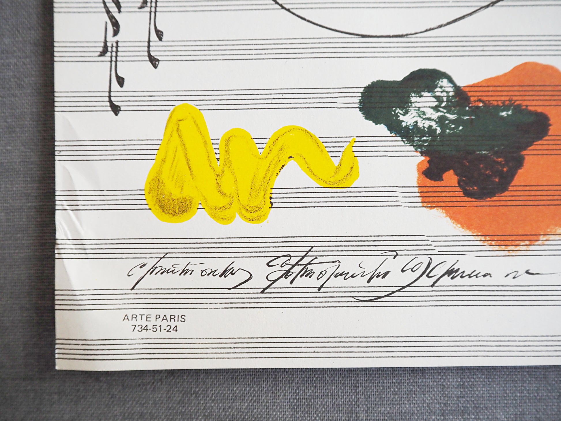 This vintage French exhibition poster is a perfect example of mid-century modern design, combining surreal watercolor clouds with unique musical-graphic illustrations.