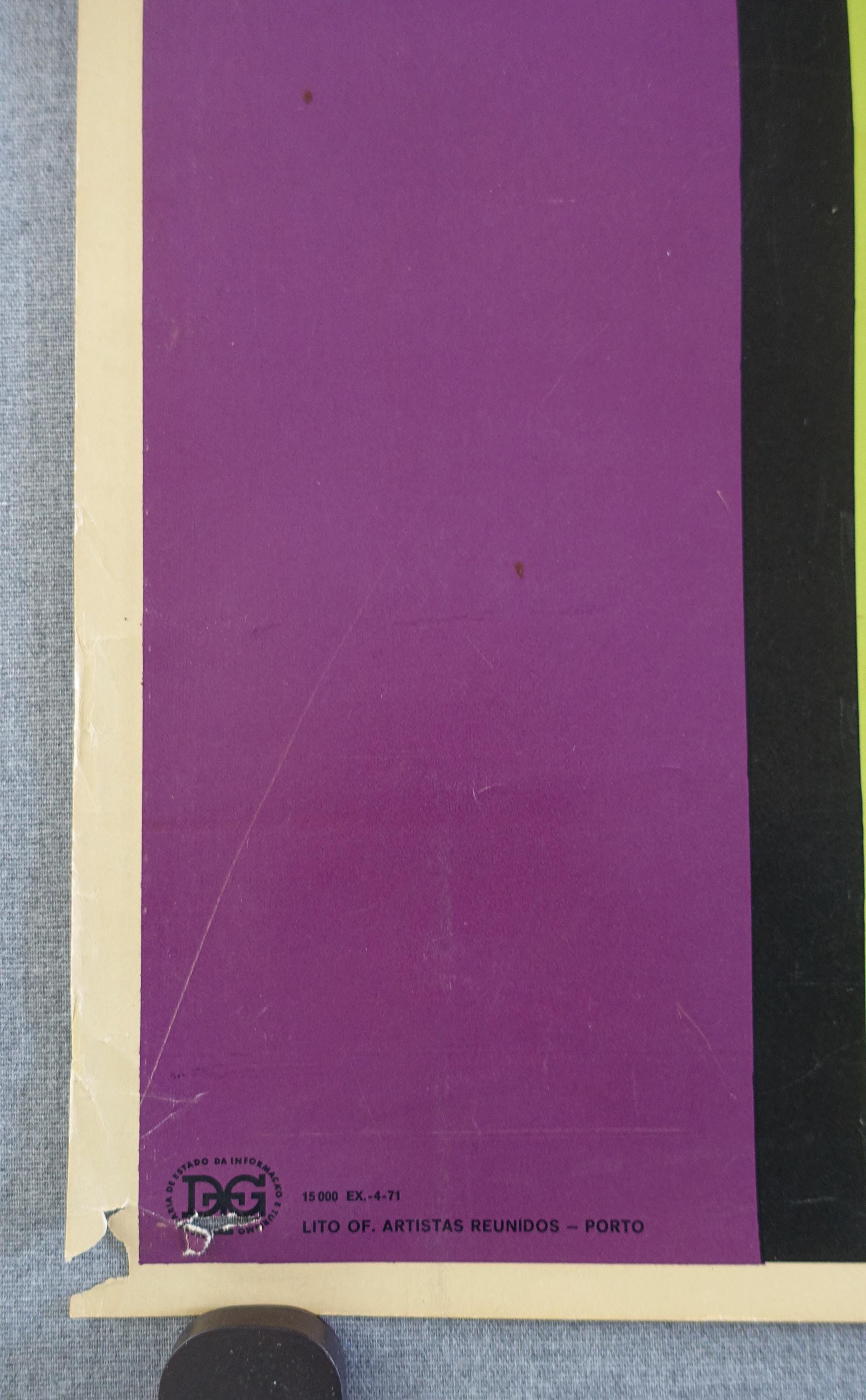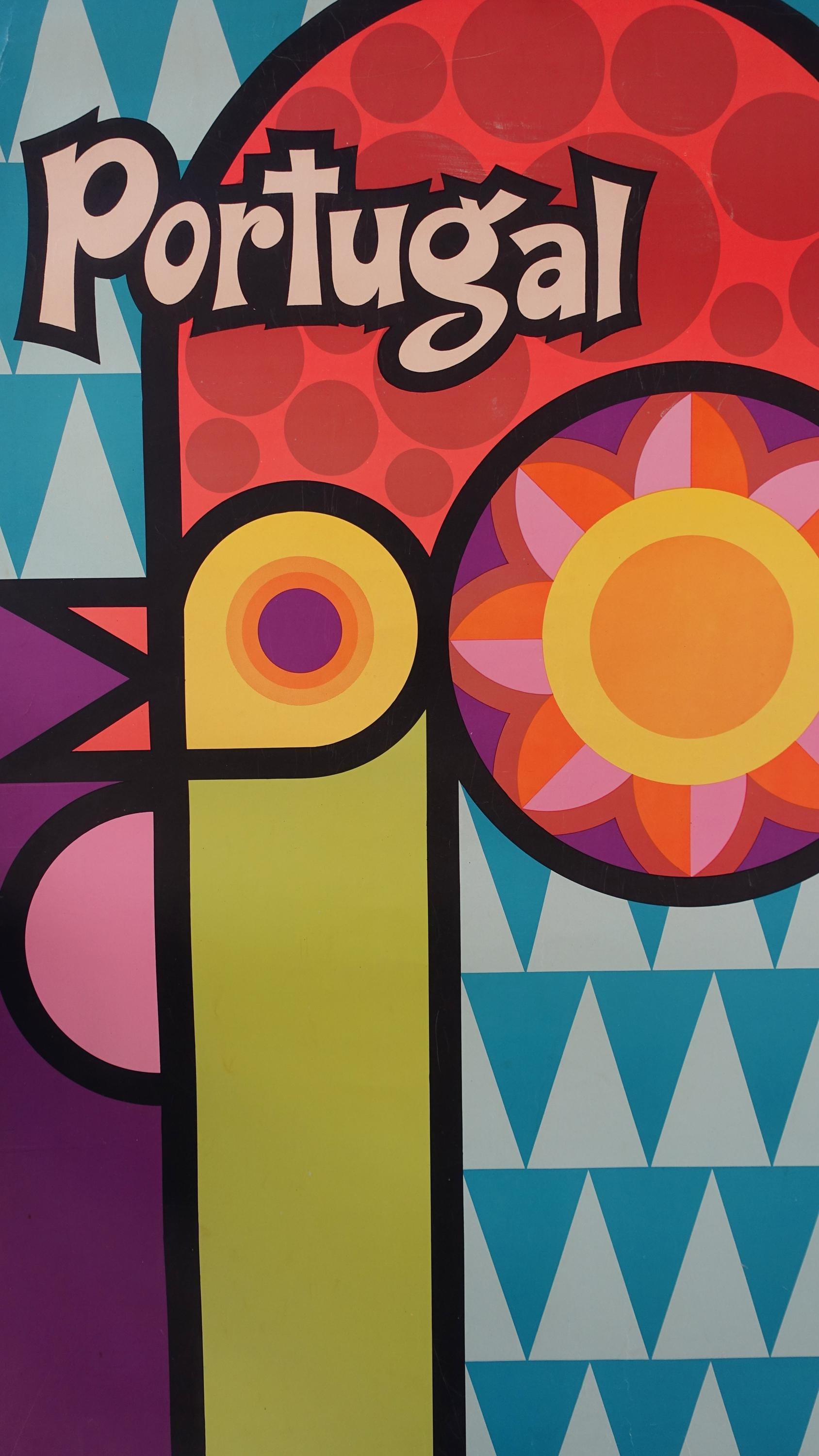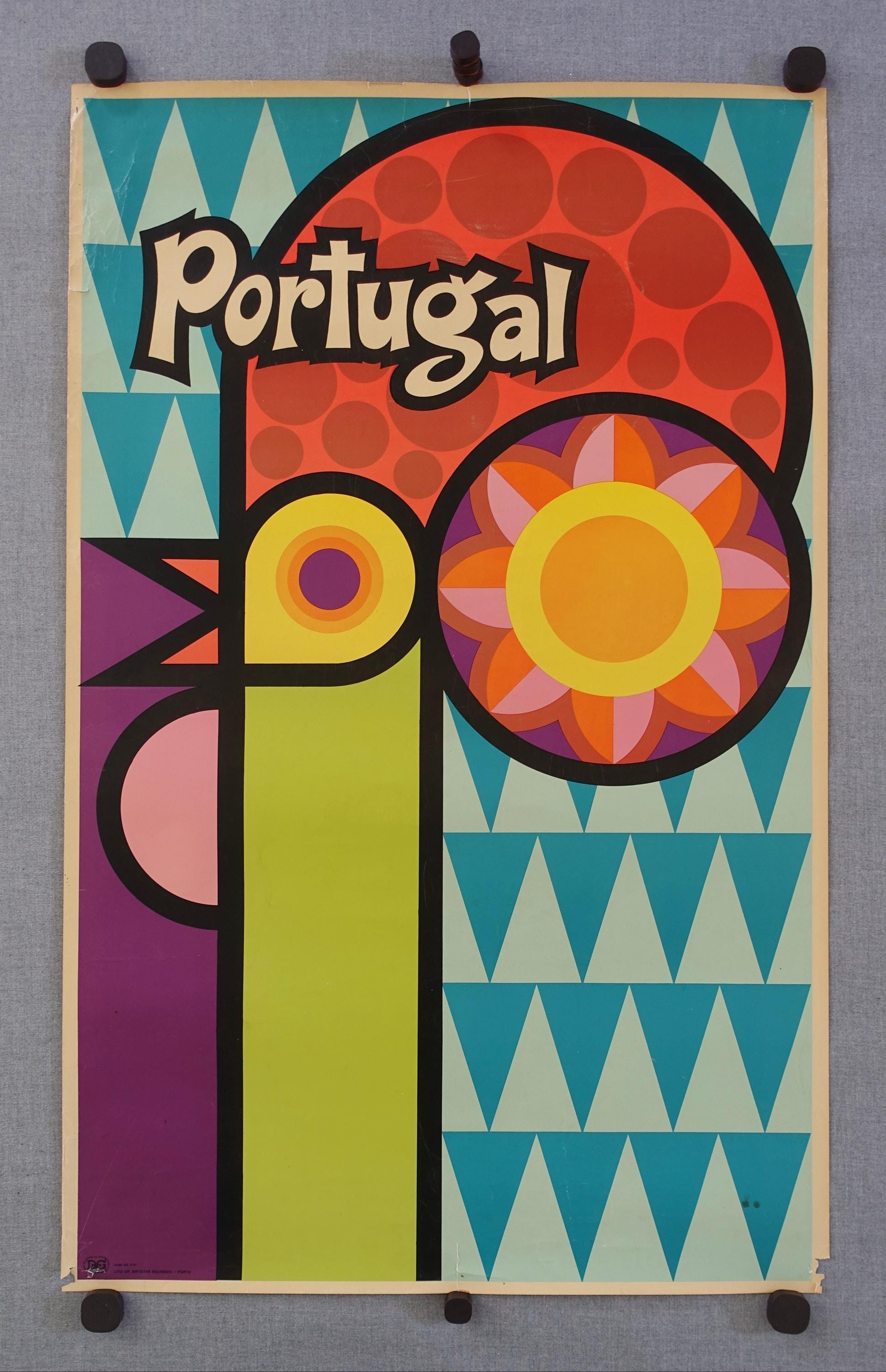 Step into the vibrant charm of 1970s Europe with this rare vintage travel poster celebrating Portugal, featuring the iconic Galo de Barcelos rooster in bold, pop art-inspired colors. A striking piece of graphic design history, this poster captures the playful optimism and artistic experimentation of the era.
