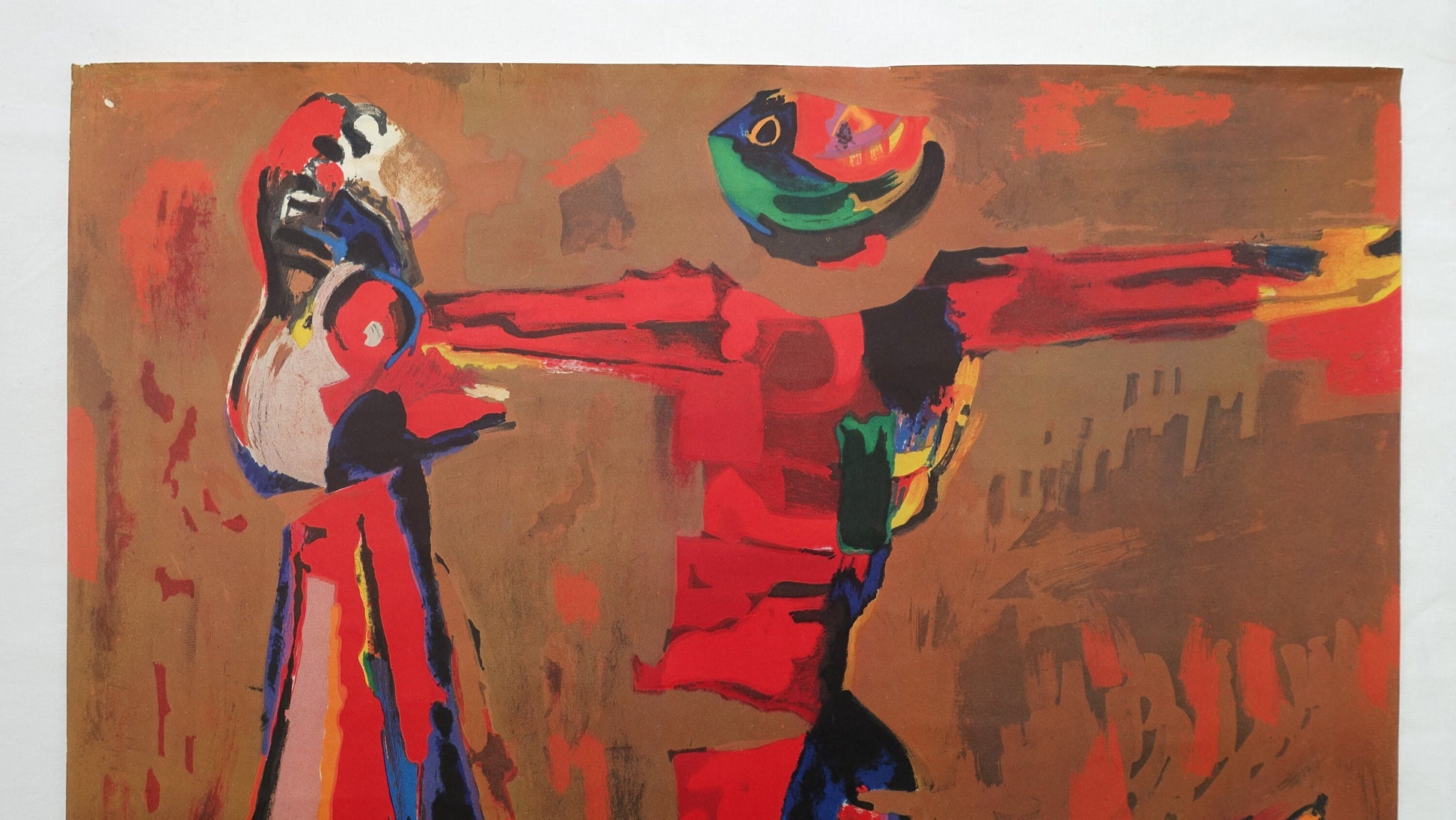 The poster displays the artwork "Man on Horse" designed by the Italian sculptor Marino Marini. Marini is particularly famous for his series of stylized equestrian statues, which feature a man with outstretched arms on a horse. He created many versions of man on horses during his career - most of them are statues and sculptures.