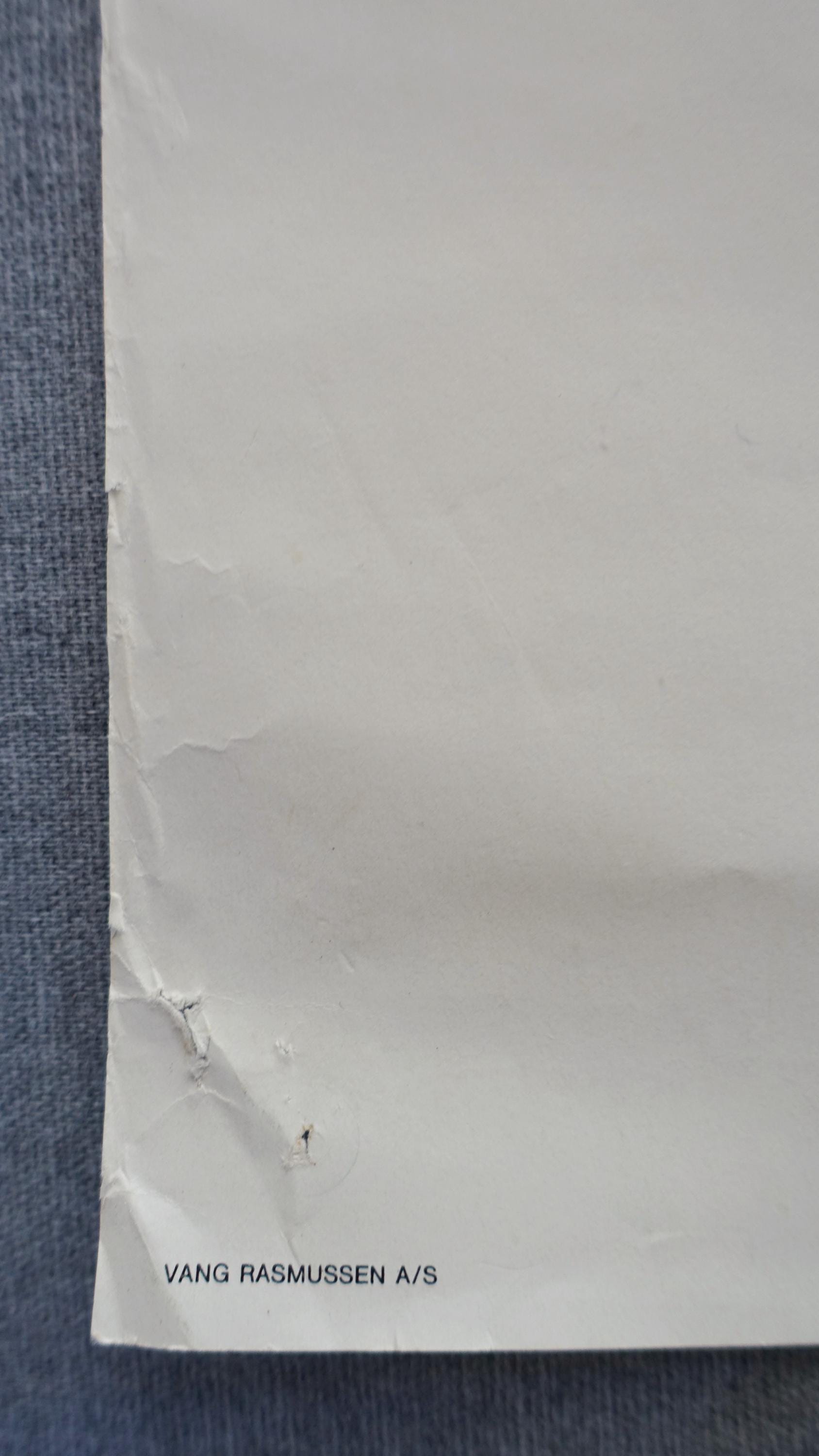 Condition: Fair condition - light handling signs, a longer tear in the bottom, traces of tape in the bottom, a minor purple stain in the left side, tiny pinholes in the corners and light wear and smaller tears on the outline - please see pictures.