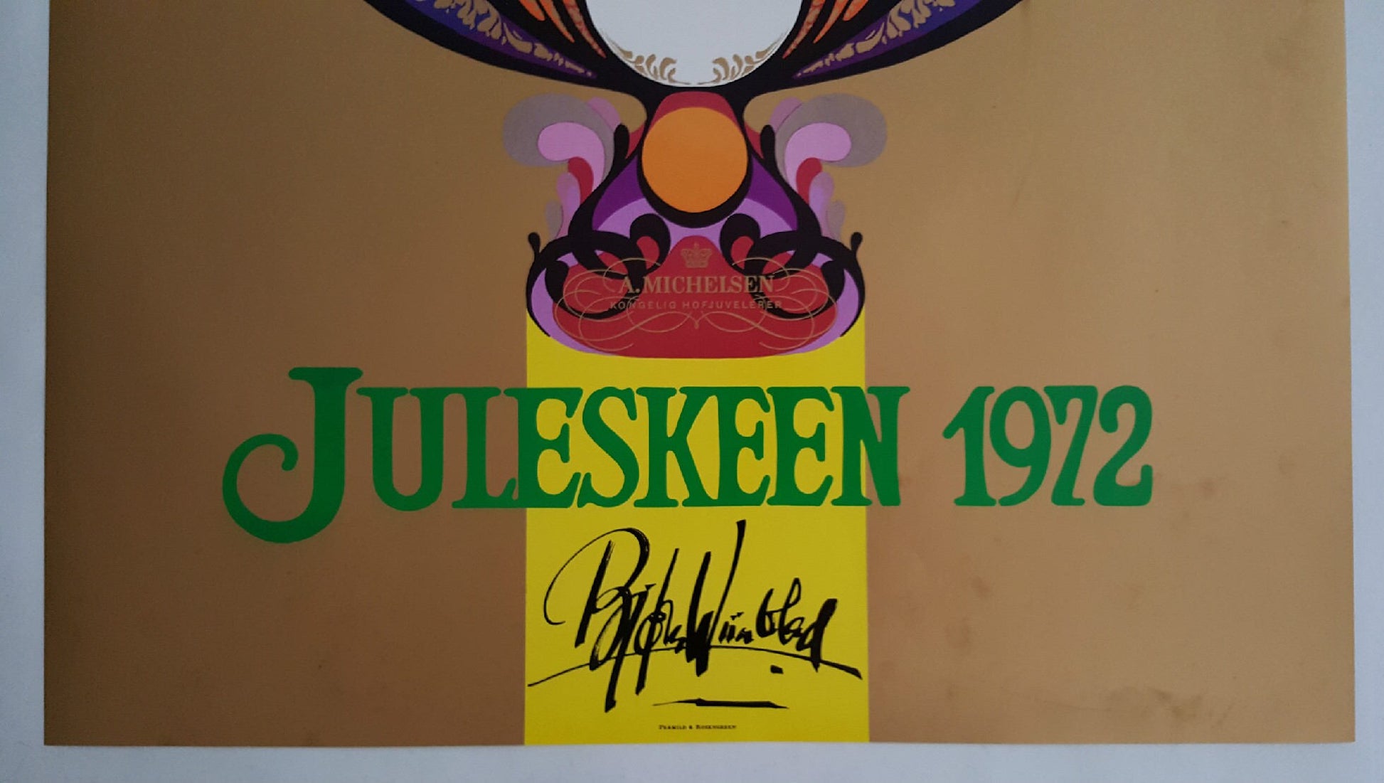 The main text on the poster is "Juleskeen 1972" (Christmas spoon 1972) so I guess A. Michelsen made an annual Christmas spoon that people would collect. However, the spoon was transformed artistically through Wiinblad's colorful and vivid imagination and pen.