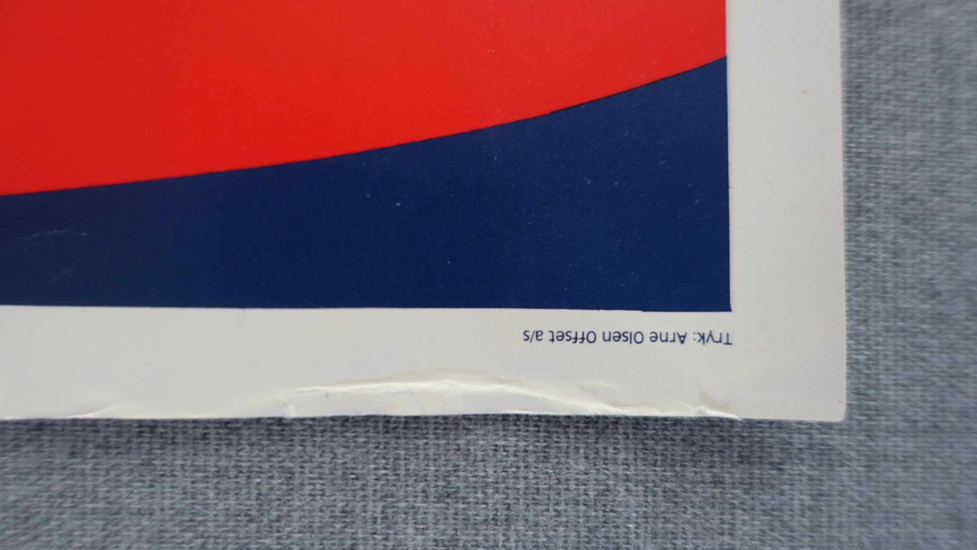 Arnoldi is a self-taught, world-renowned modernist artist. He is particularly known for his posters and considered one of Denmark's most important poster artists. He is known for a tight and easily recognizable form and color language. As a painter, Per Arnoldi always uses primary colors (red/yellow/blue) on a bed of black - just like on this very poster.