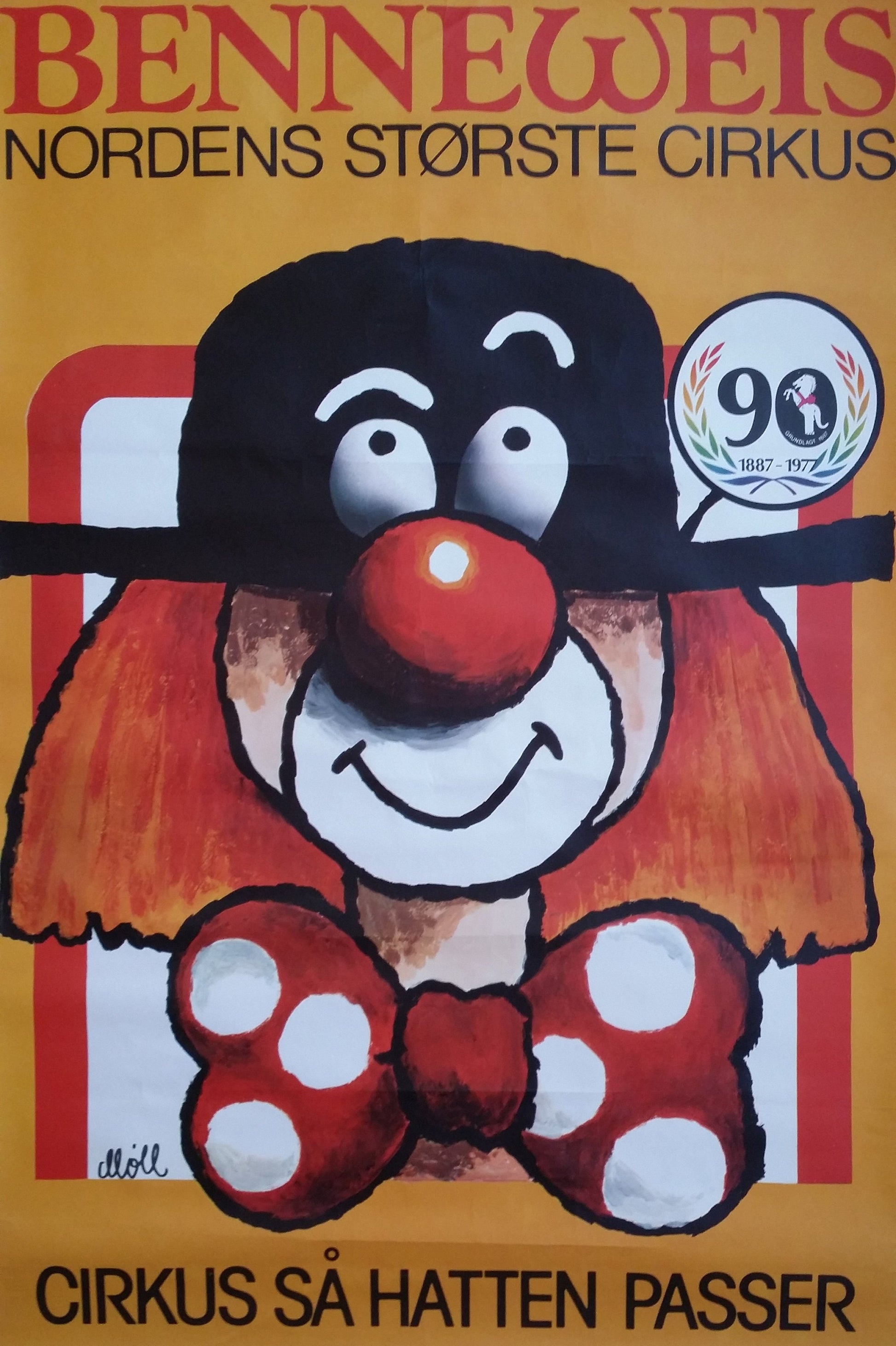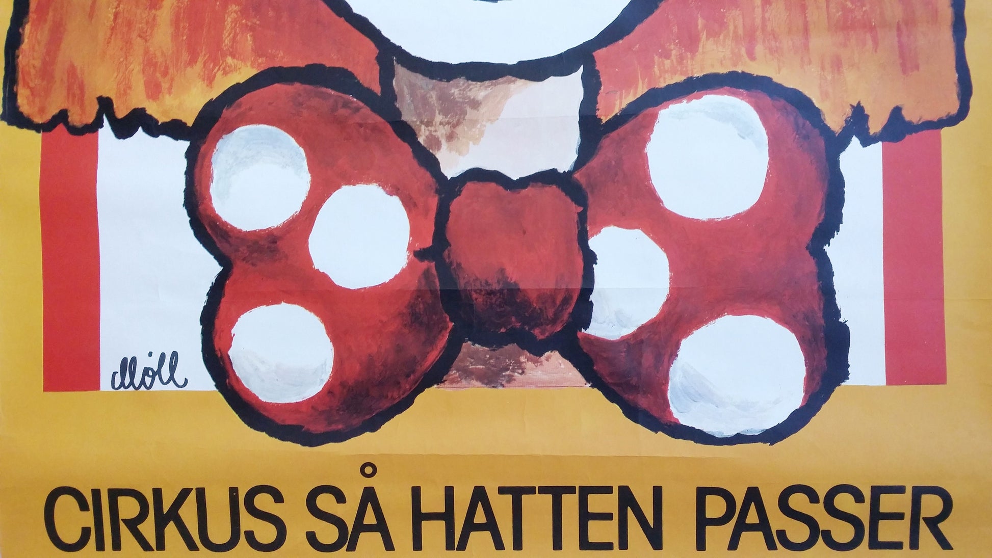 In the bottom of the poster is a saying in Danish; "Så hatten passer" which means to get something in abundance. This refers both to the circus' great shows but also to the hat of the clown which looks like.. an abundant hat!