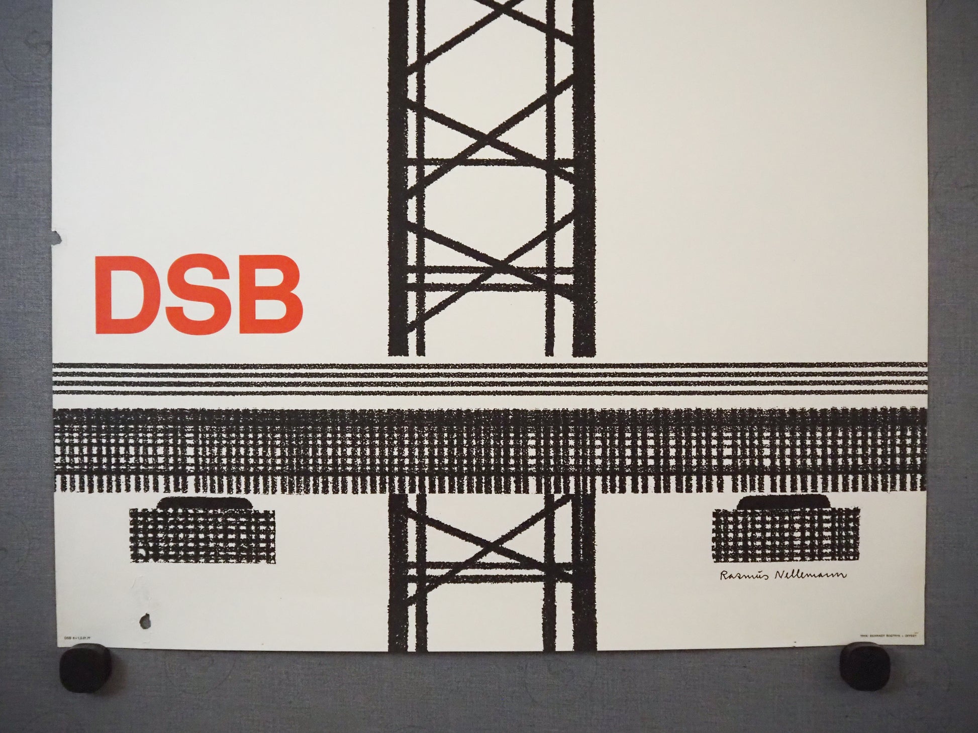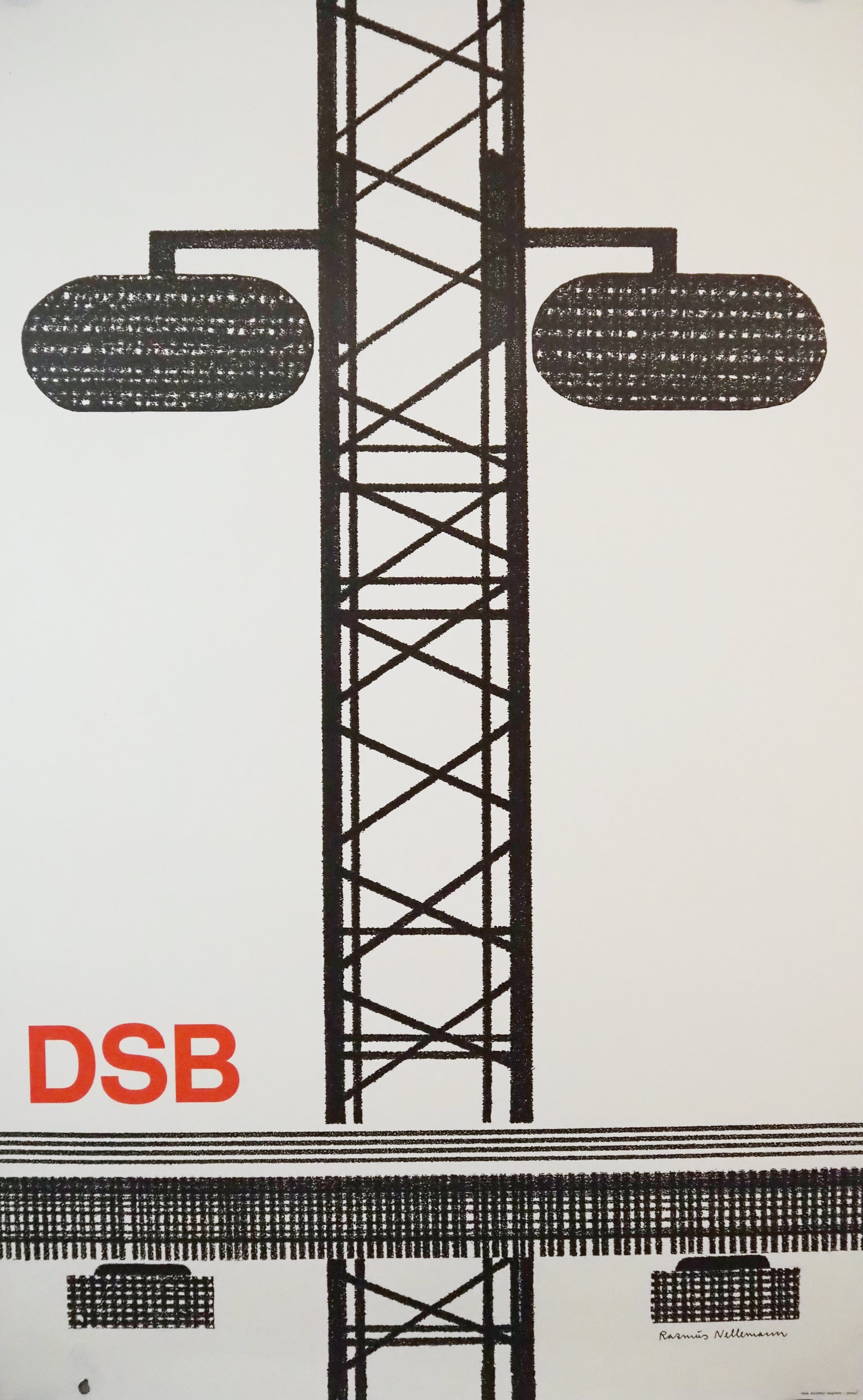 This striking original poster was created in 1977 for DSB (Danske Statsbaner), Denmark’s national railway. Designed by the renowned Danish graphic artist Rasmus Nellemann, it is a beautiful example of Scandinavian modernist poster art.