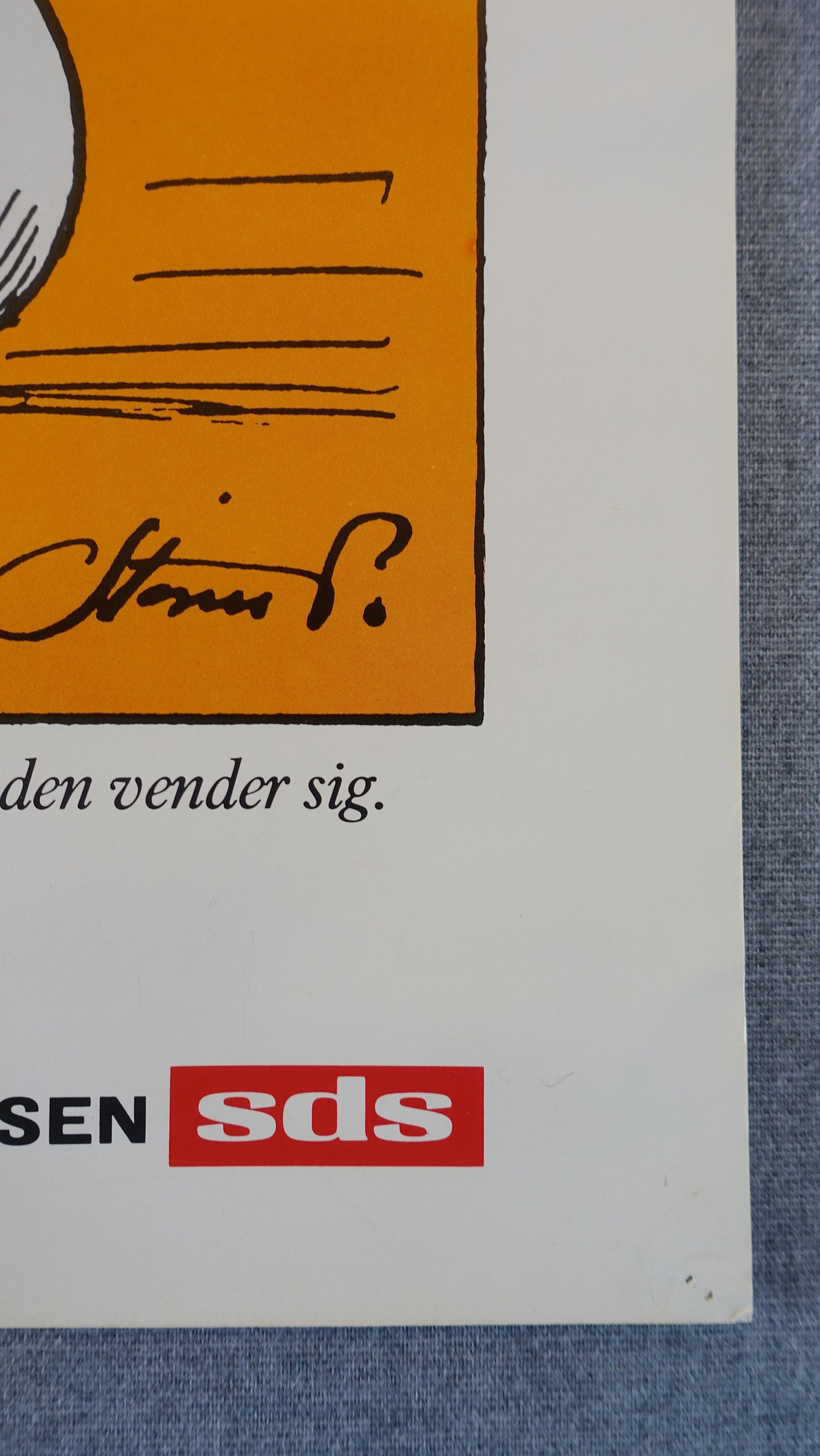 "You run the risk that the wind turns" - so says this humors cartoon poster by Storm P. which also works as an ad for the SDS Savings and (at that time) the newly open Storm P. Museum in Frederiksberg, Denmark (which opened in 1977).