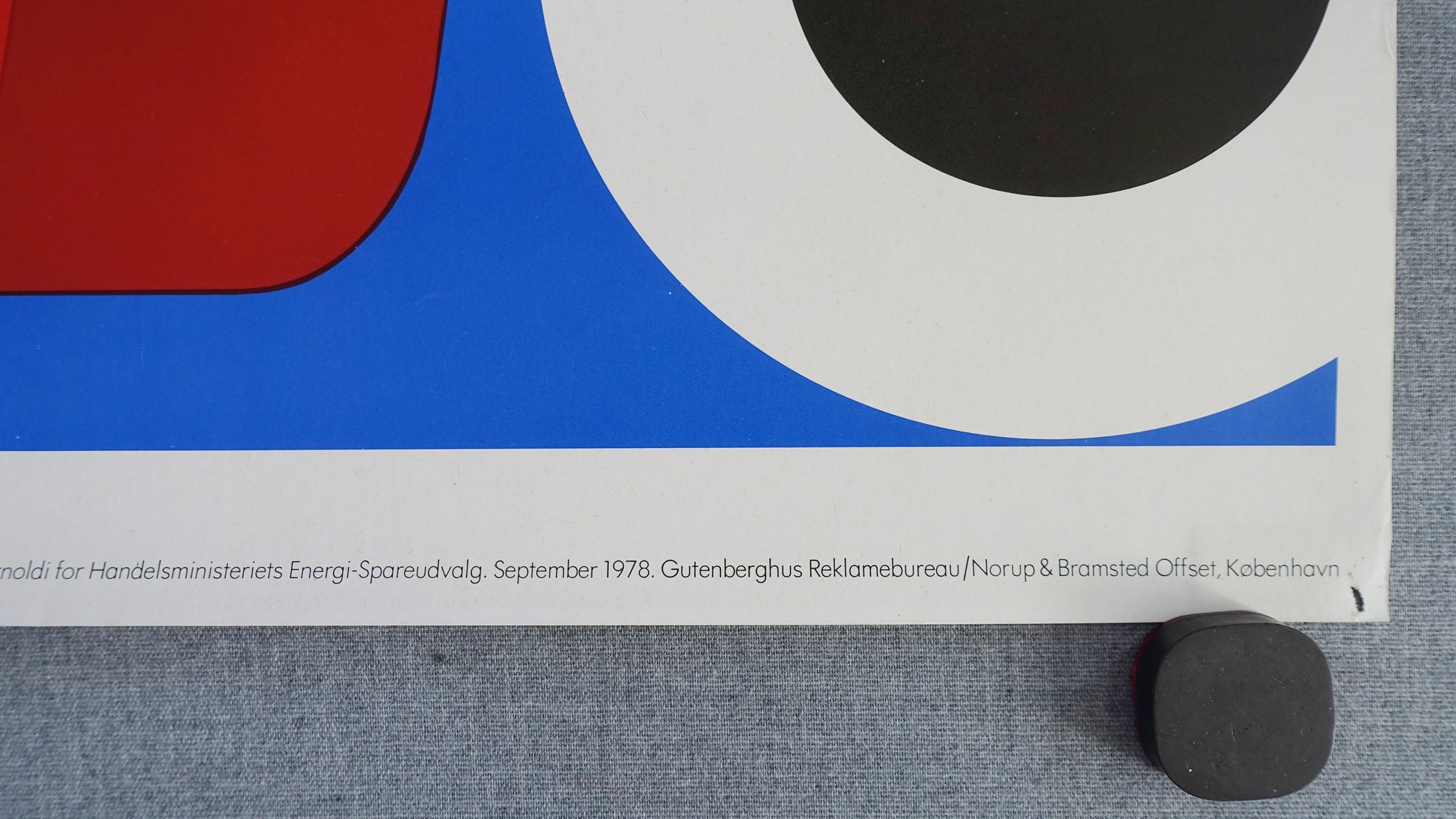 The man was Per Arnoldi and he was hired to make campaign posters to encourage the Danes to save energy. This poster is a part of a collection of four different poster that was commissioned by Trade Ministry's Energy Saving Committee of Denmark (Handelsministeriets Energi-Spareudvalg).