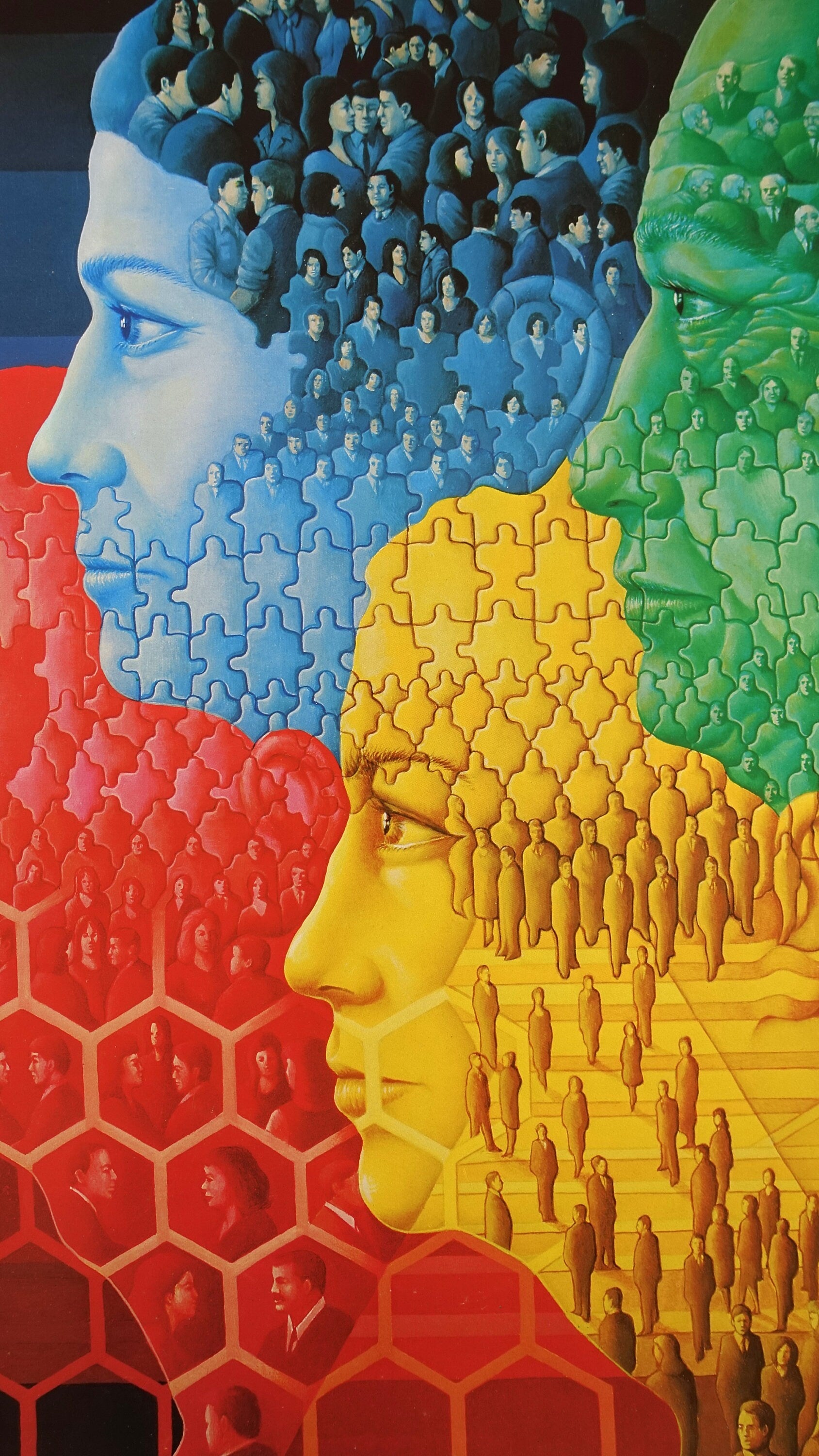 The artwork on this poster has been used in many different purposes for example the cover for Billy Cobham's "Culturemix - Colours" from 2005, covers for psychology books and more. However, only a part of the full image (as it is reveal on the poster) was used for the album and book cover.