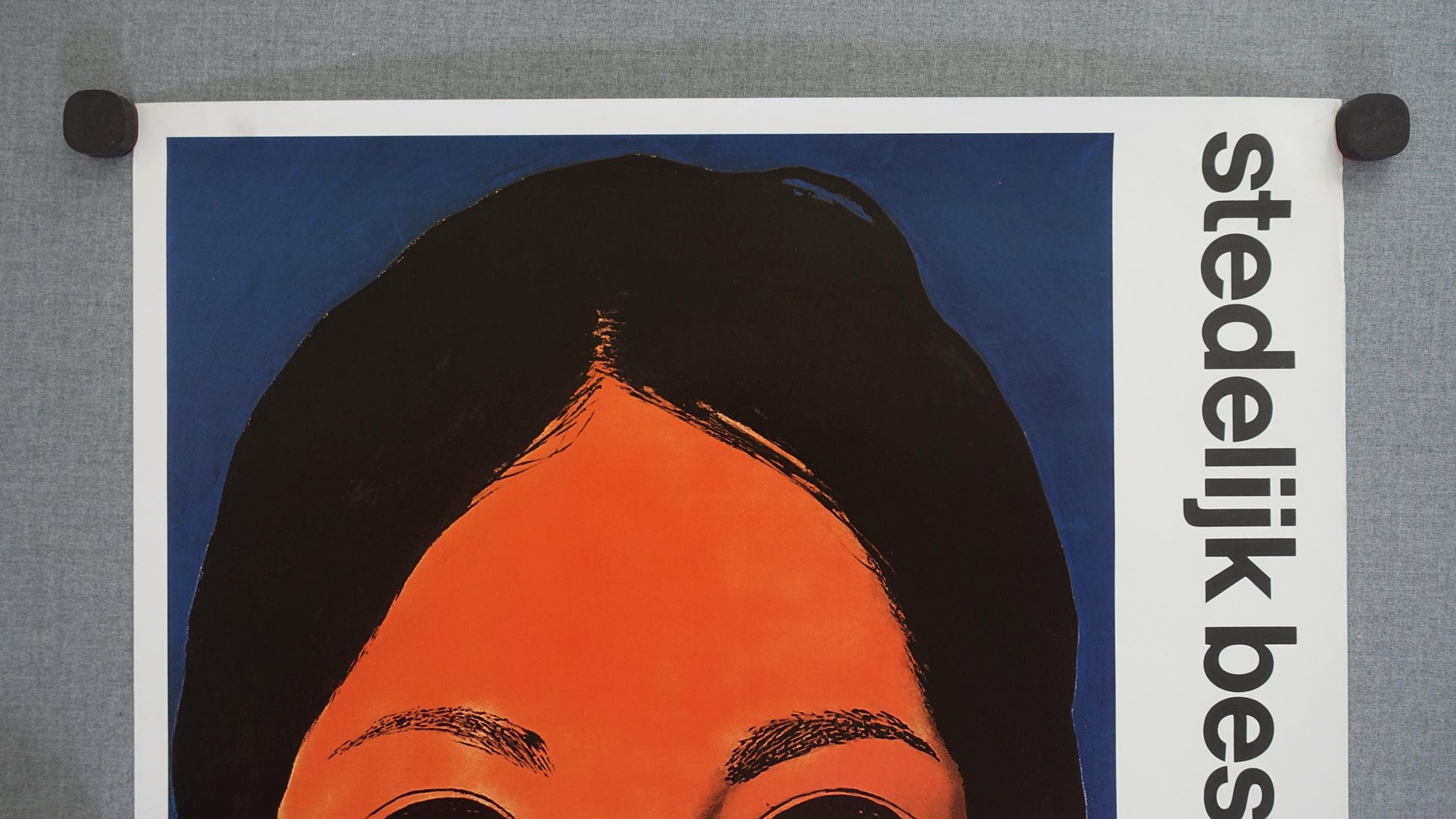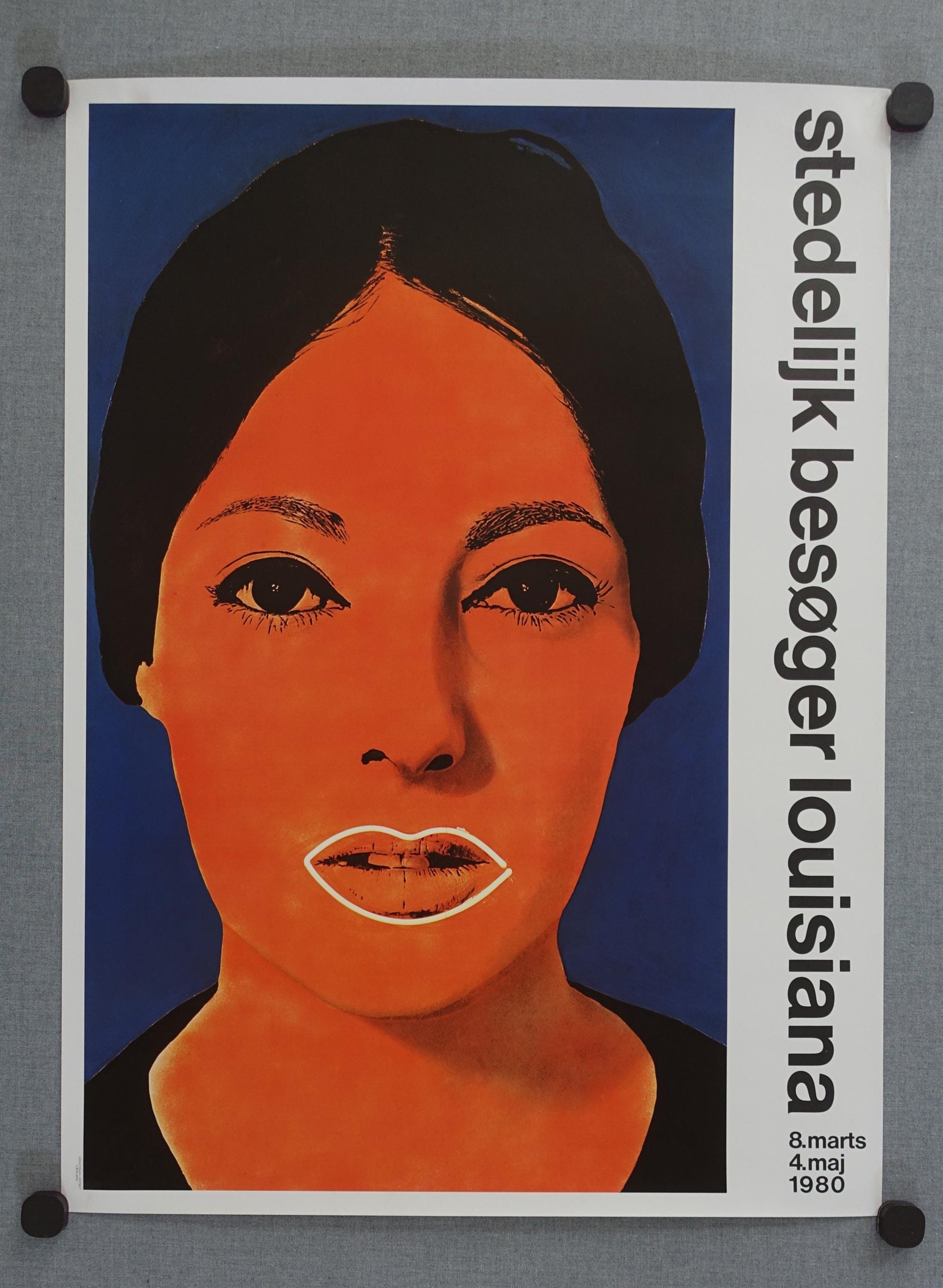 This poster features a striking, saturated image: a woman’s face rendered in vibrant orange set against a bold blue background.