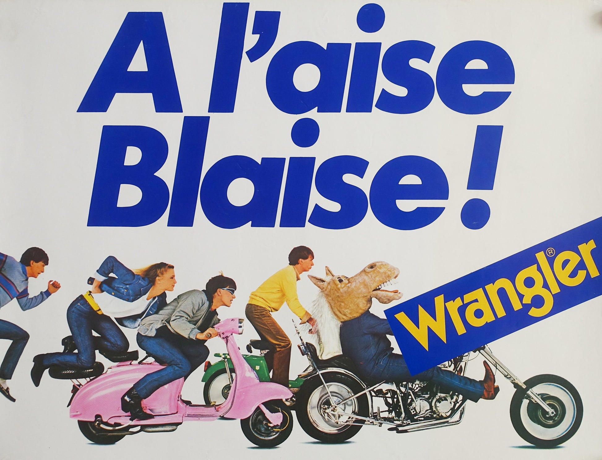 The poster features a group of busy young people in Wrangler with the French text: "at ease Blaise" in the top. Blaise is the name of a Wrangler line so the poster basically says "chill" I guess.