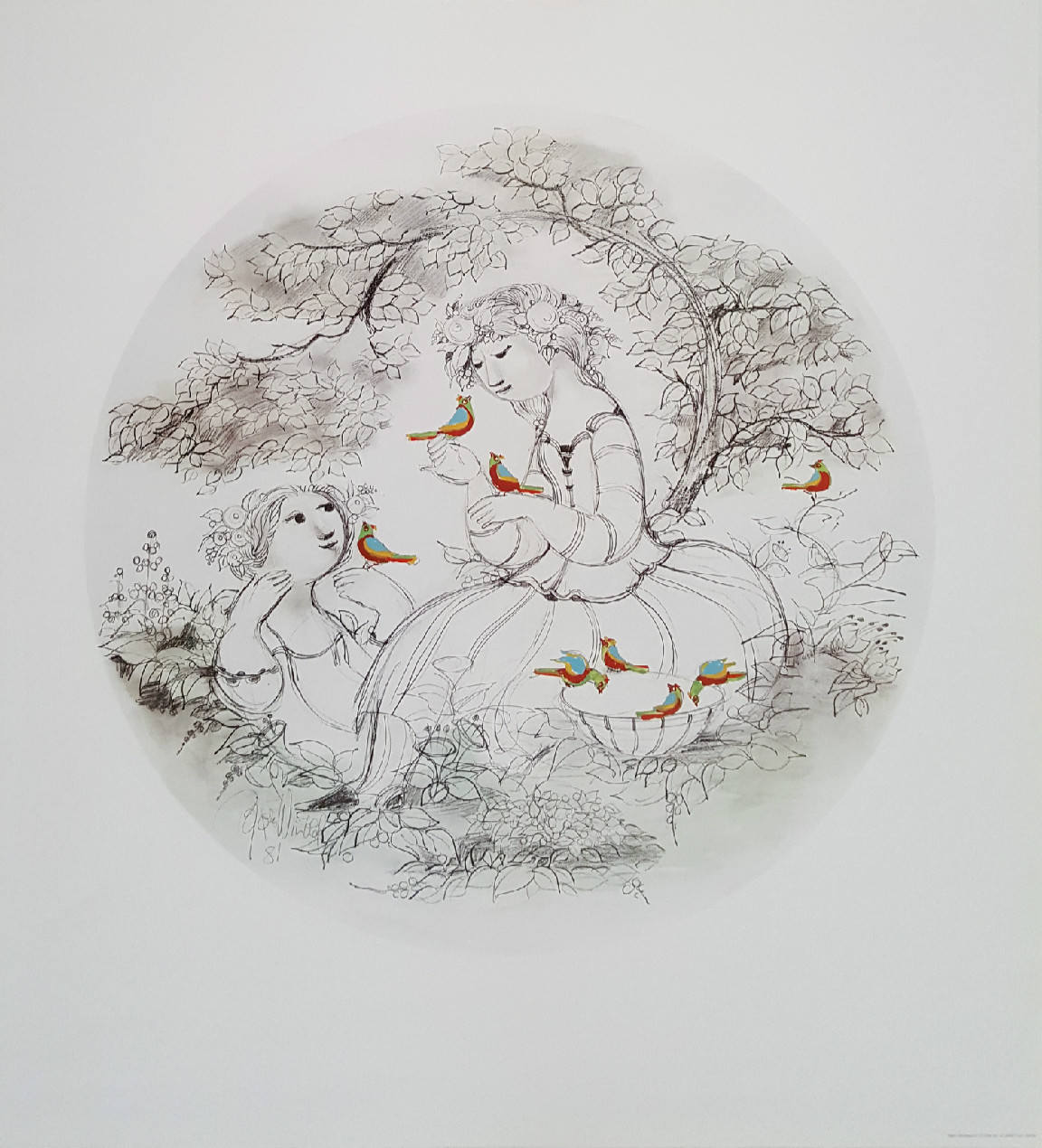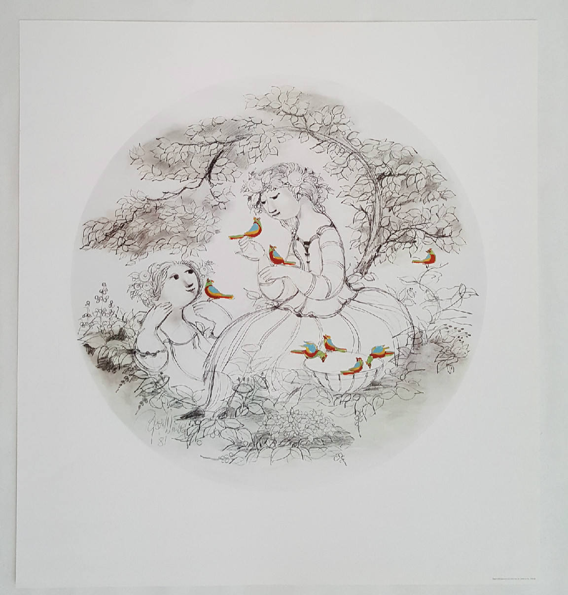 This beauty displays a scene from a forest where two young girls are hanging out and are suddenly surrounded by a herd of friendly birds. The impression of spring is very clear in the motif as Wiinblad has highlighted the birds with colors which signals that they are bringers of/or a symbol of spring.