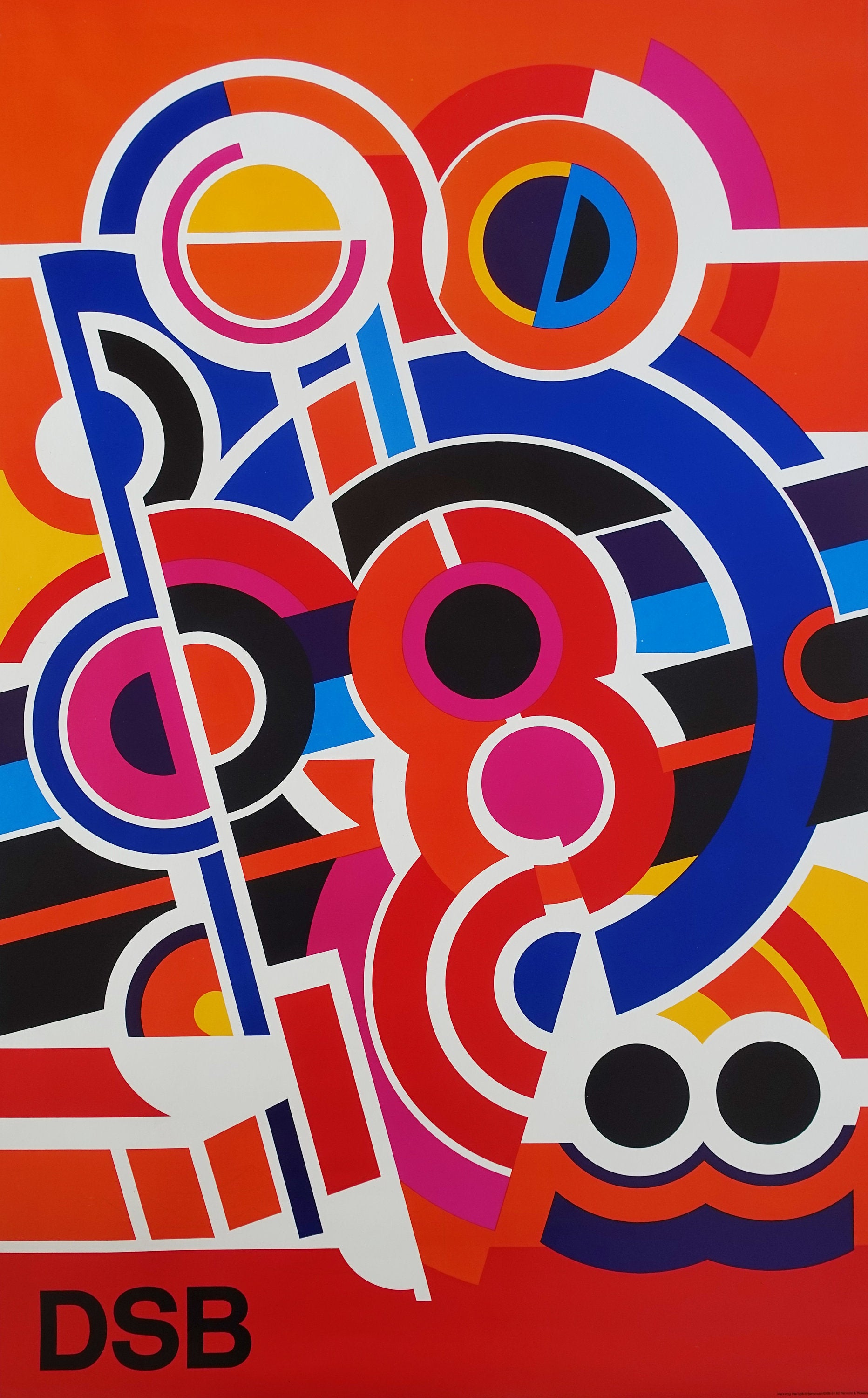 In 1982 Damgård Sørensen designed six colorful and figurative posters to be used on stations owned by Danish State Railways. The poster is abstract but one can see the inspiration from the wheels of a steam locomotive.