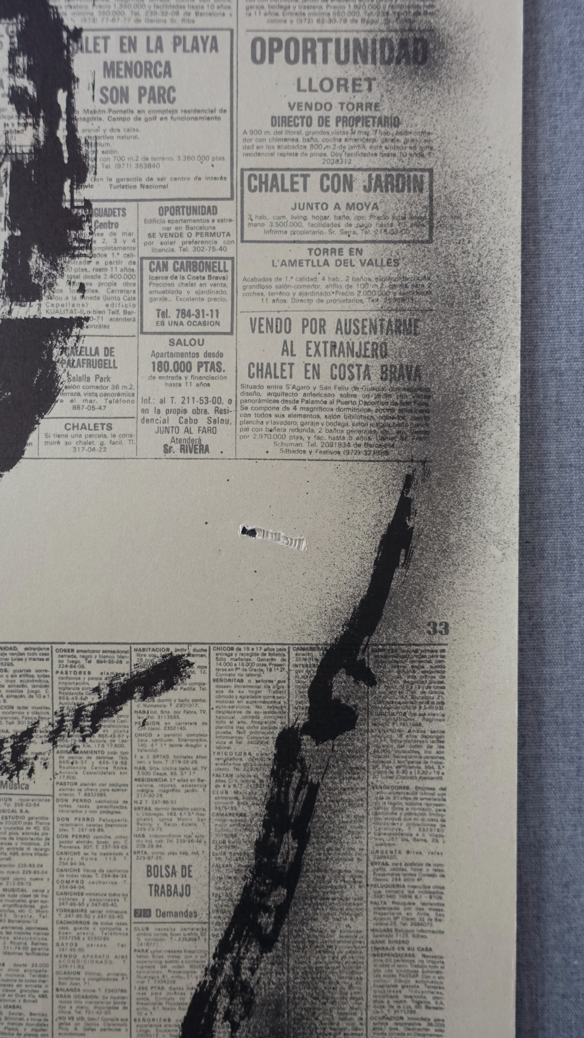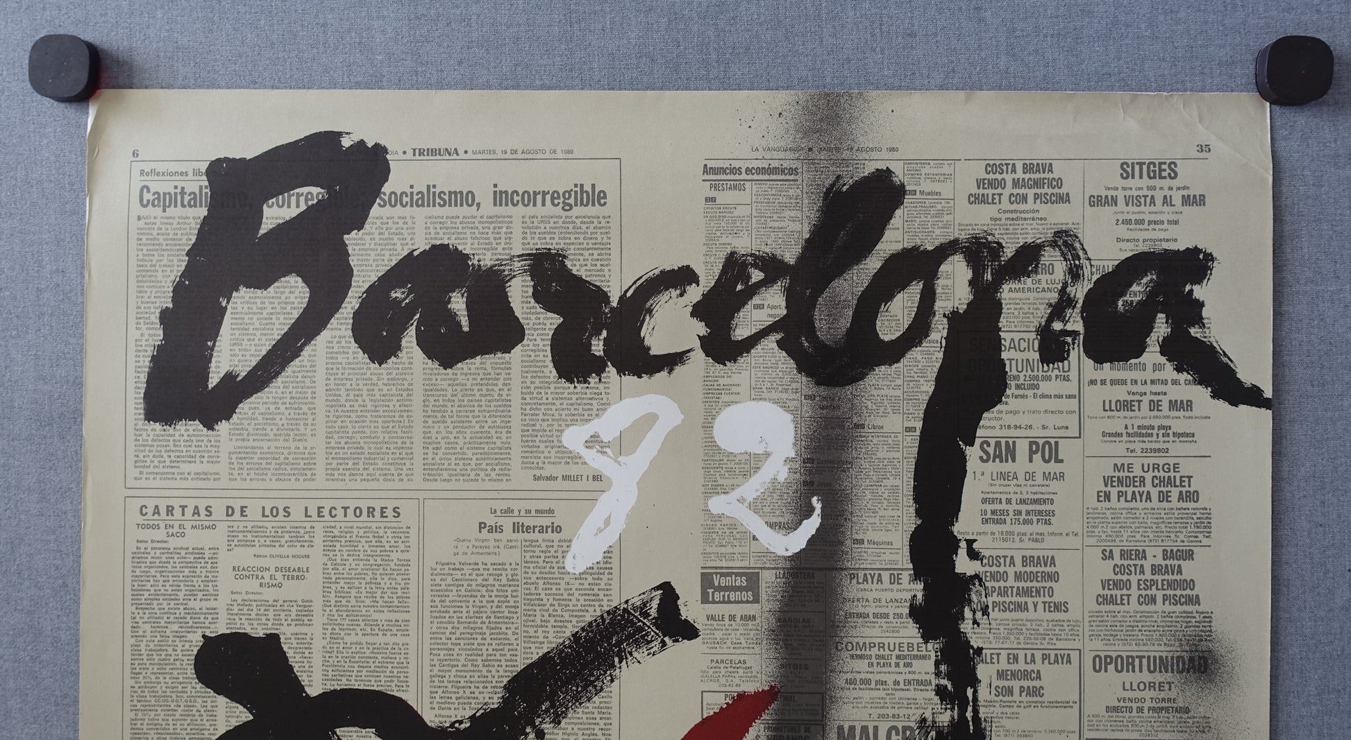 This poster represents the city of Barcelona and displays (what I believe is) an abstract foot kicking a ball on a background of newspapers.
