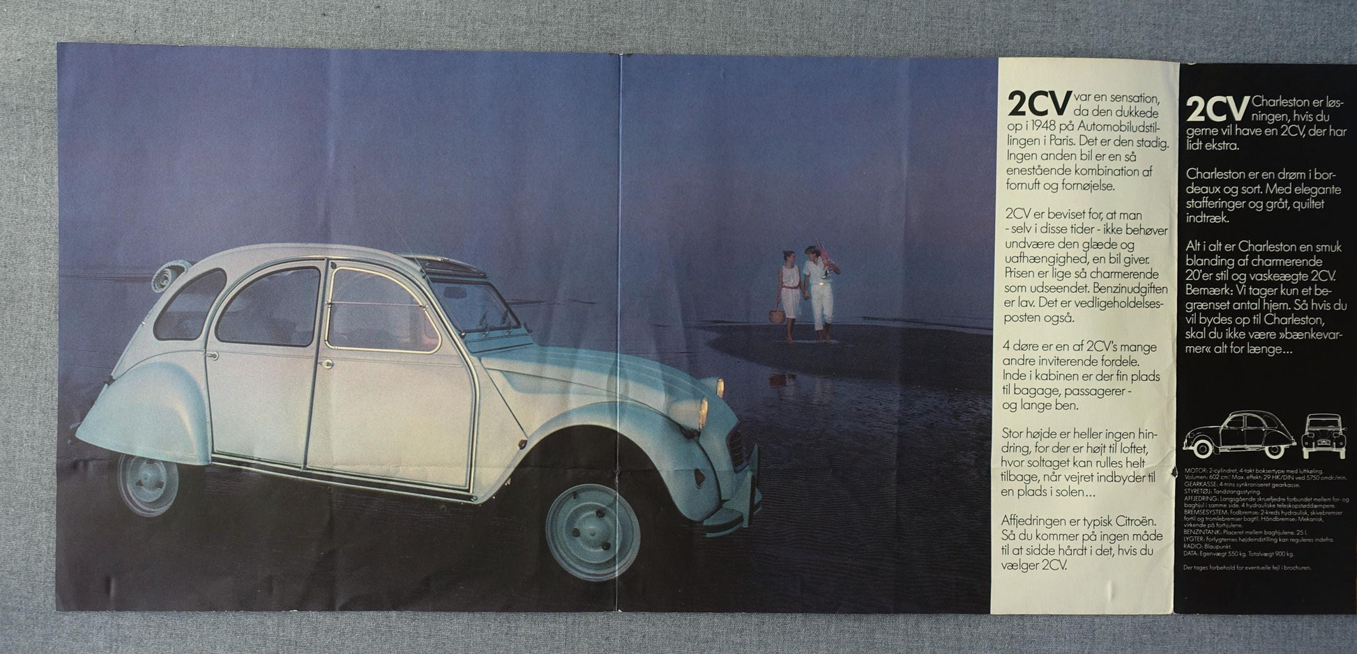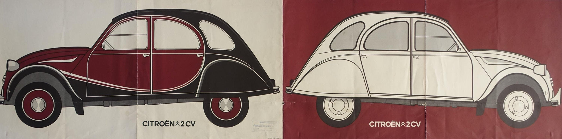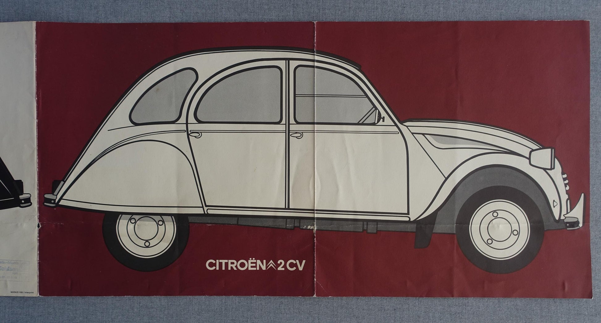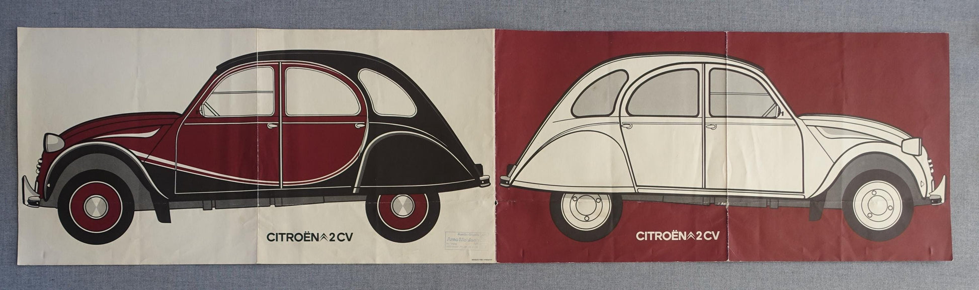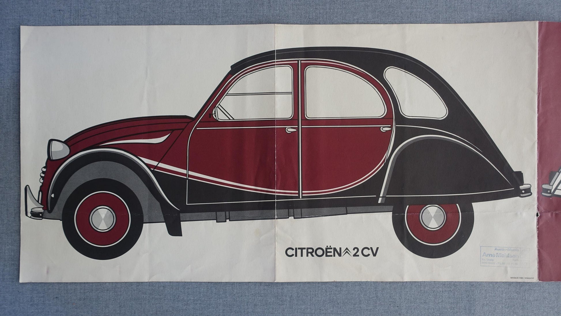 The poster is a Danish fold-out poster that came with the car. On the backside of the poster is nine images telling the story of 2CV records and how the car was used for different purposes.