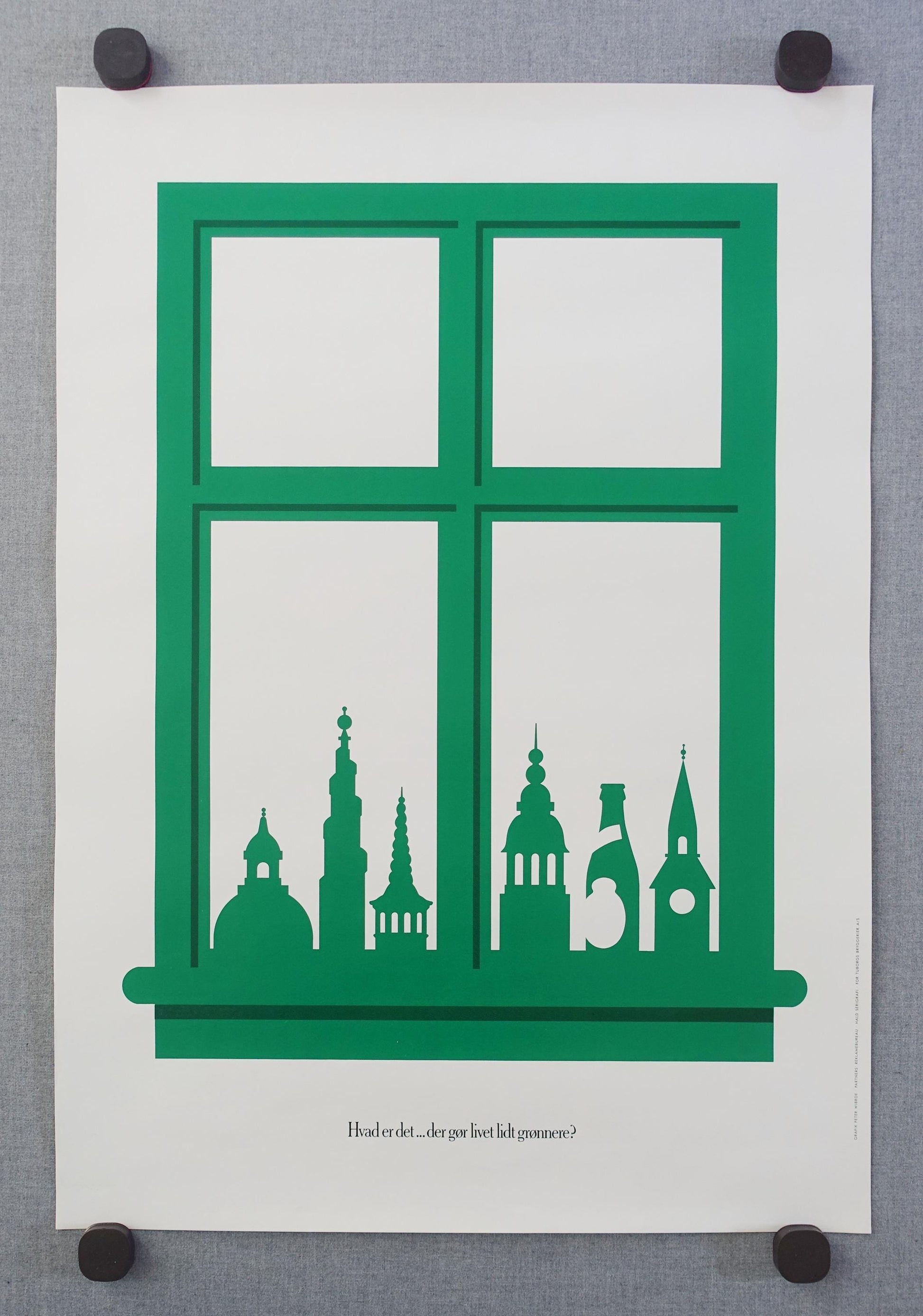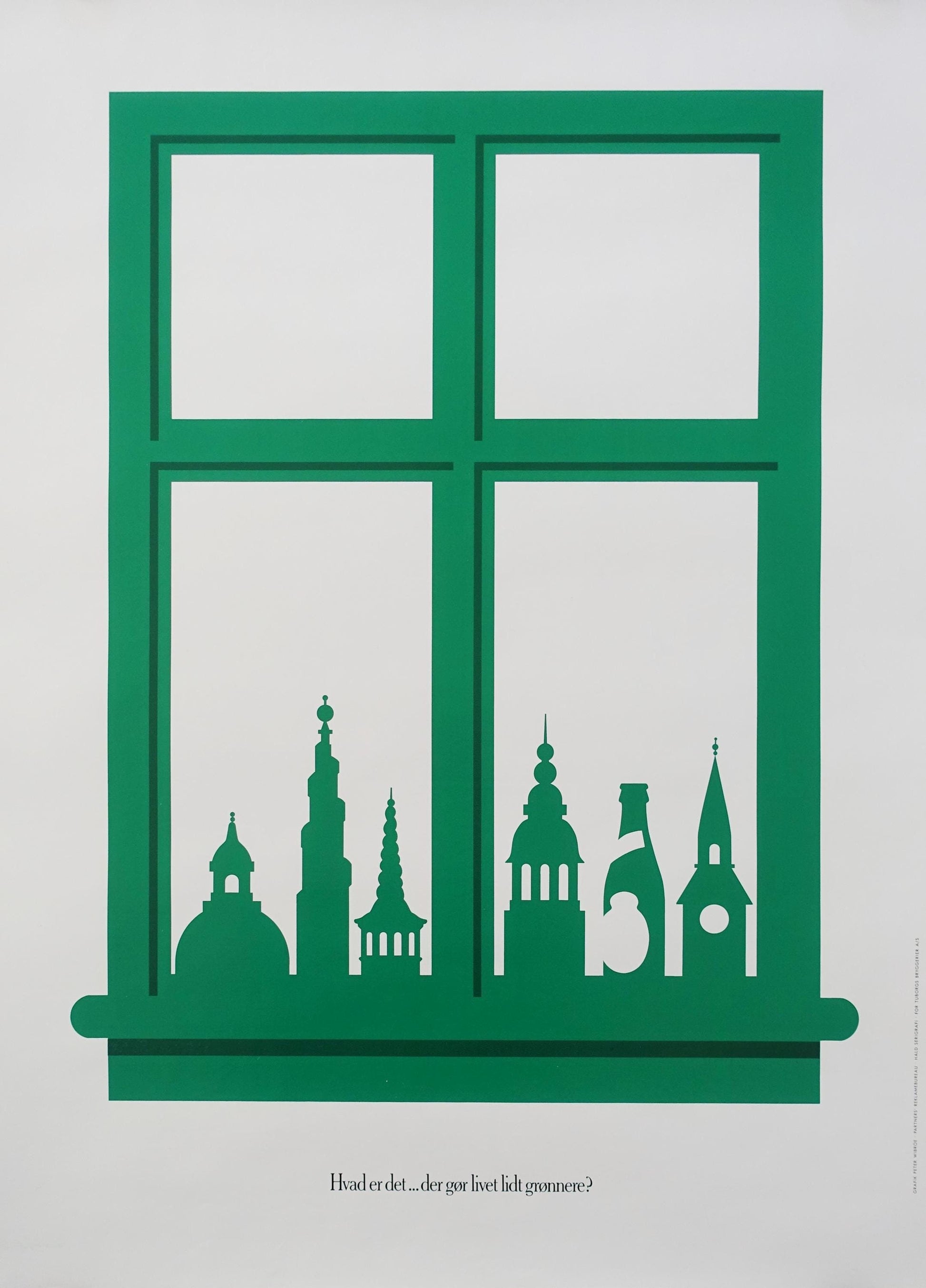 The poster displays a window with a view to the most famous towers of Copenhagen (home town of Tuborg). However, it looks like a huge bottle of Tuborg sneaking into the picture. This is an advertisement for Tuborg Beer but you have to know a bit about Tuborg to understand that this is actually a Tuborg Beer advertisement.