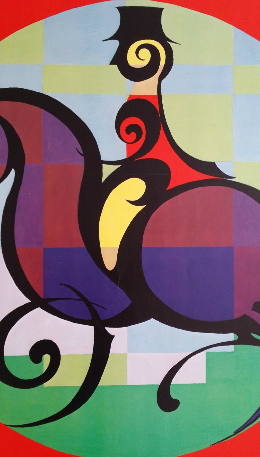 The Danish artist Bjørn Wiinblad made this poster for the "Sports Riding Club" (Sportsrideklubben) when they hosted The European Championships in Dressage. The event took place north of Copenhagen in 1985 and this poster was made as an advertisement for this event.