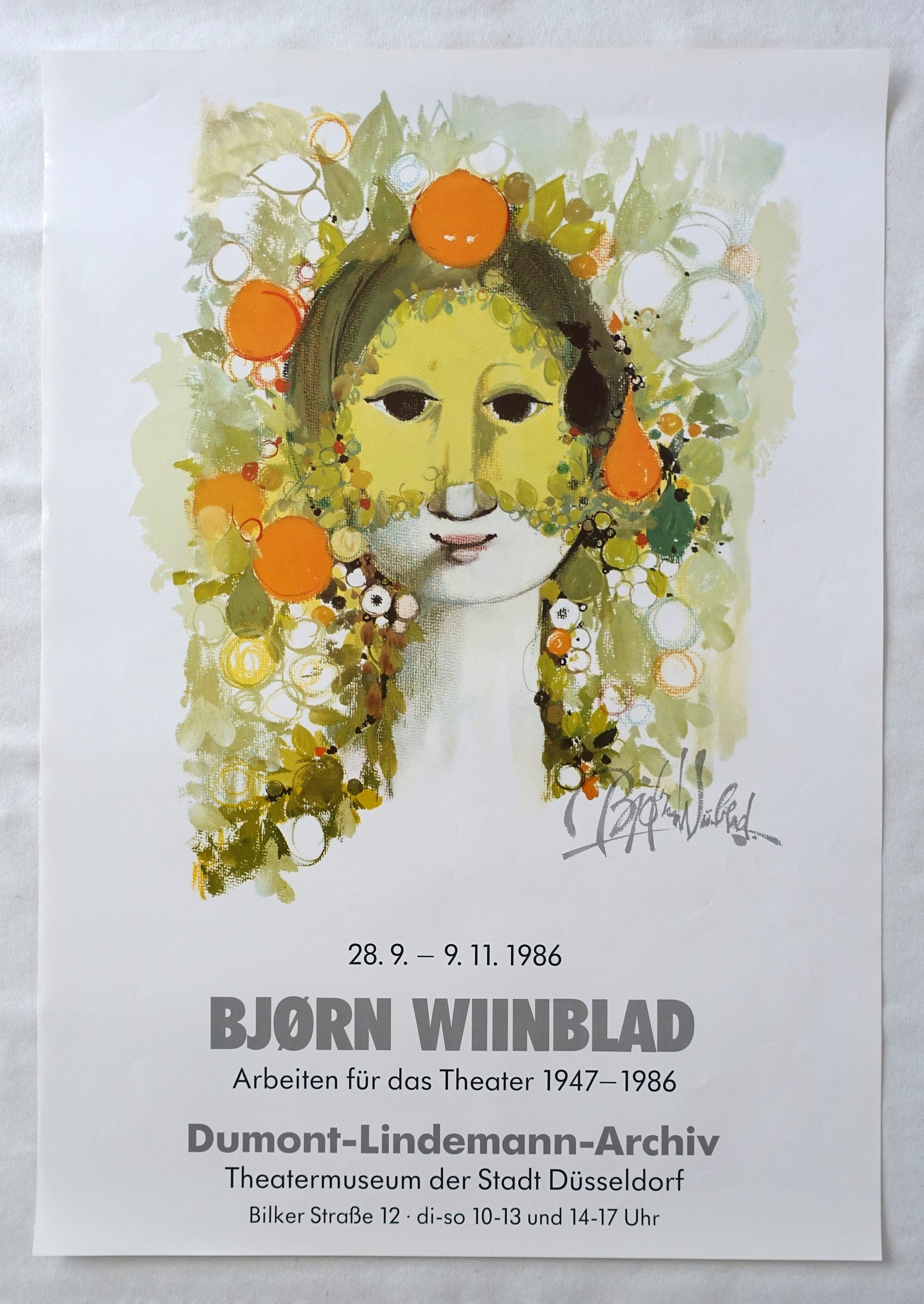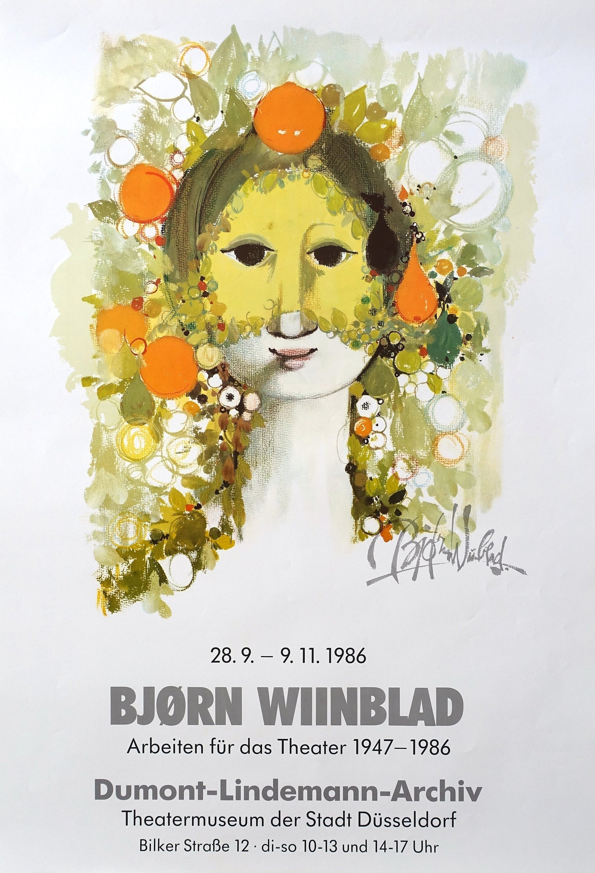 The poster advertises a Wiinblad exhibition in Düsseldorf (Germany) with theatre works from 1947-1986. Wiinblad designed several costumes, dresses, stage curtains etc. in his long career.