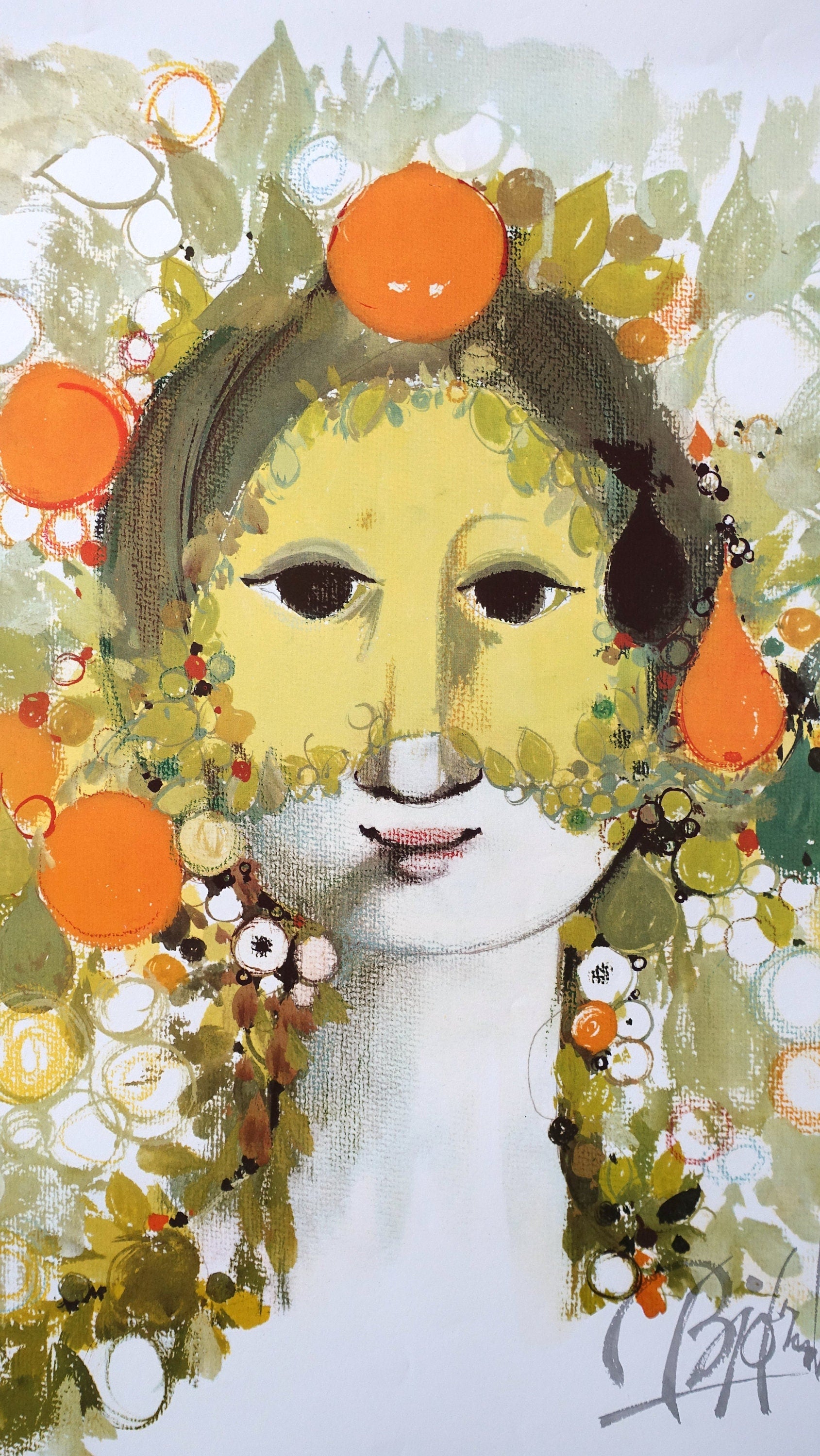 This poster is accurately a mask sketch for a theater performance. Wiinblad designed many decorations and costumes for both revues, plays, ballets and this poster is the sketch for goddess Ceres' mask in the Shakespeare performance "The Tempest". The play was set up in Dallas Theater Center in Texas from 1965–1966.