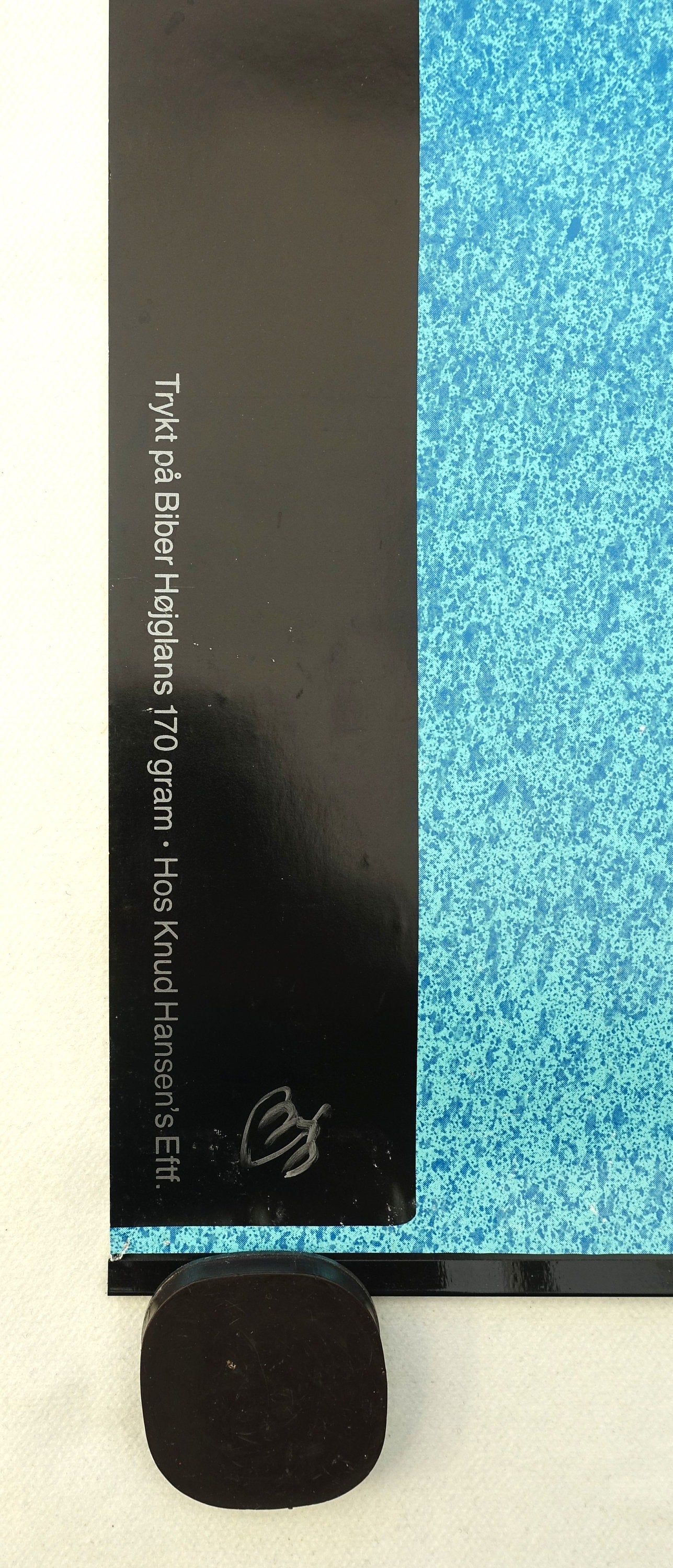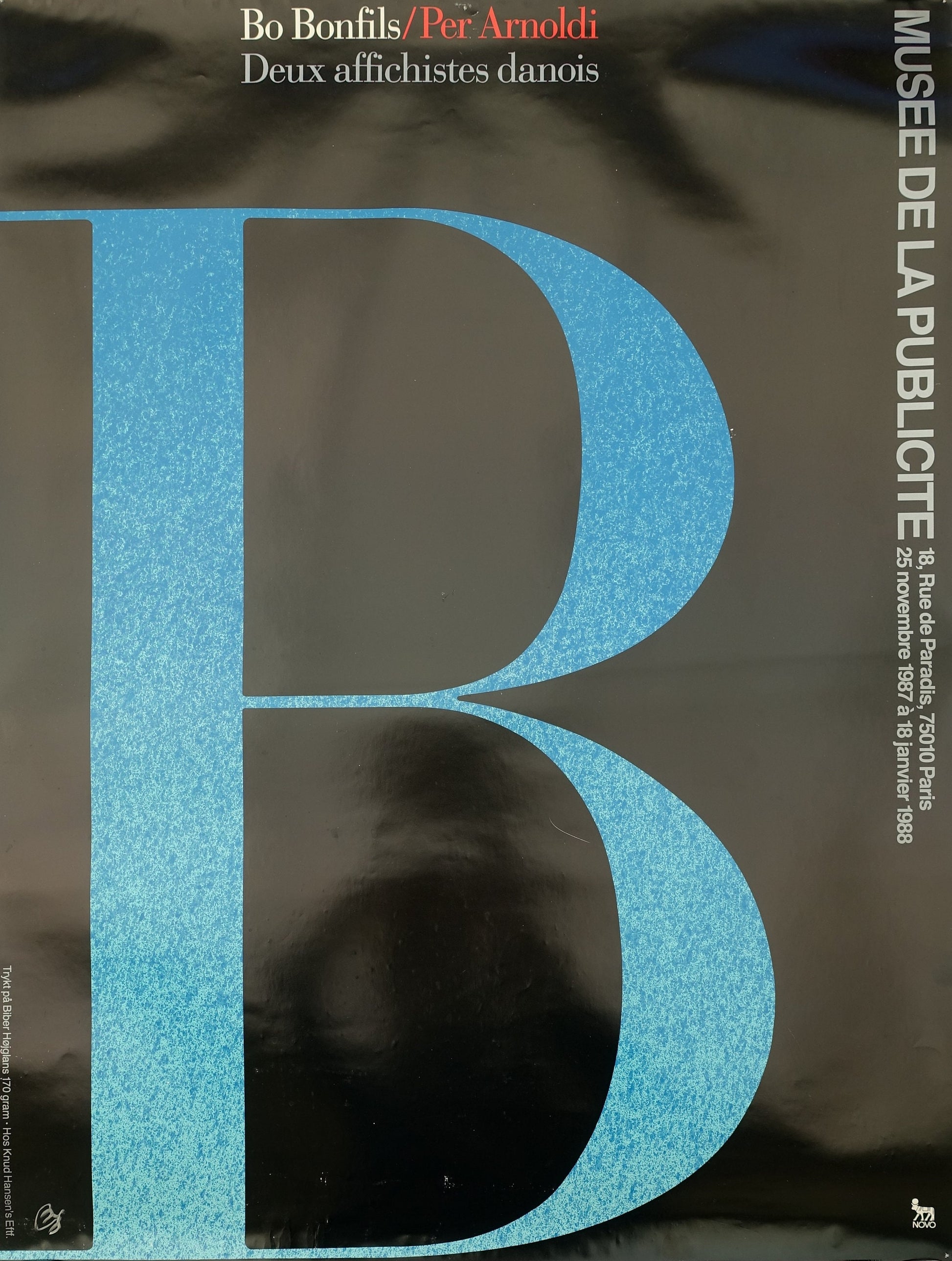 The poster was made to encourage people to visit an exhibition with posters by the Danish modernist artist, Per Arnoldi and Bo Bonfils. The exhibition was set at Musee de la Publicite on Paris in 1987.