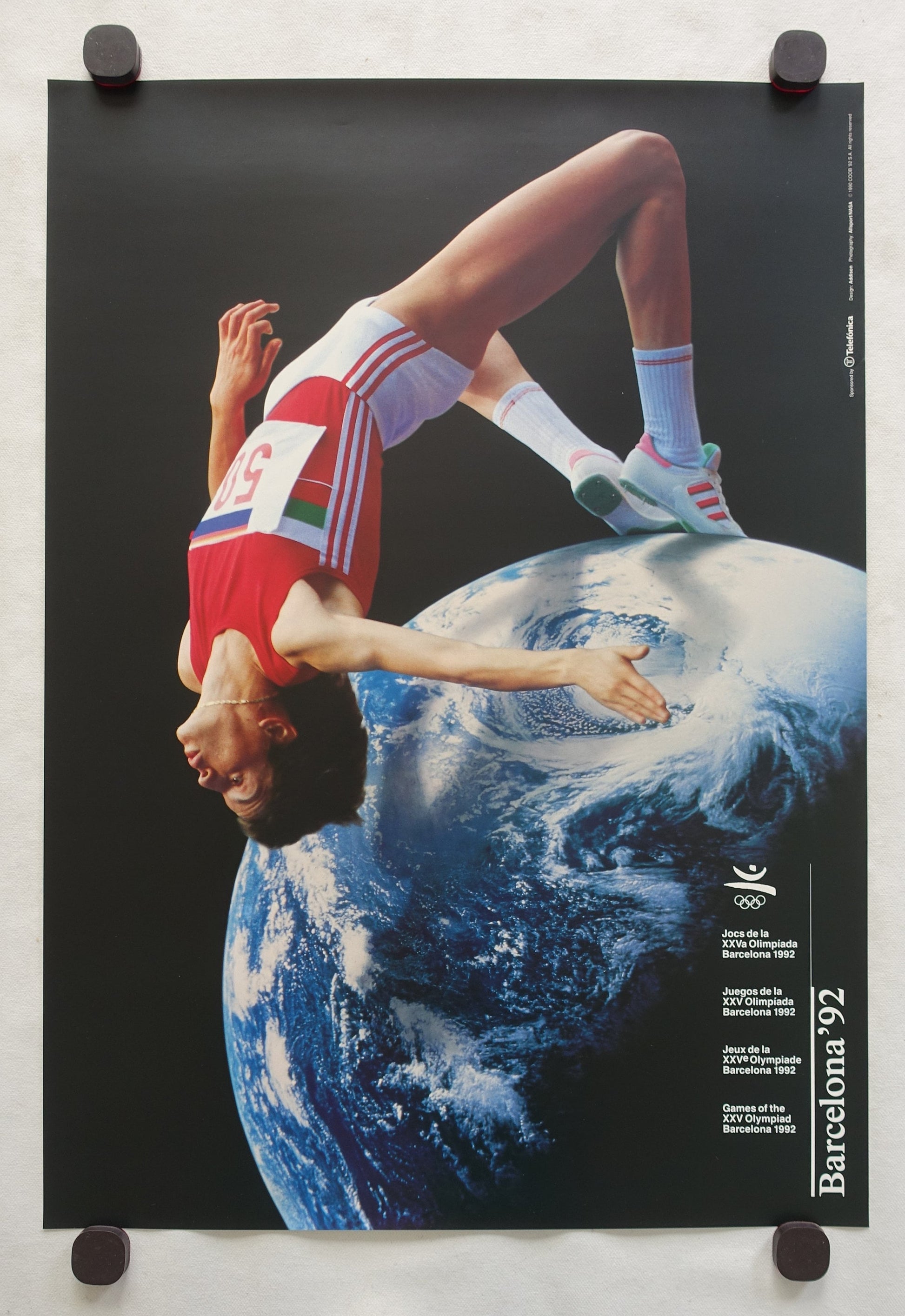 An official poster was designed for each discipline and features one or more enlarged athletes standing on the Earth. This symbols the importance of the Olympics Games as a global event but also makes a synergy with the 1992 World Expo held in Seville with the theme discovery.