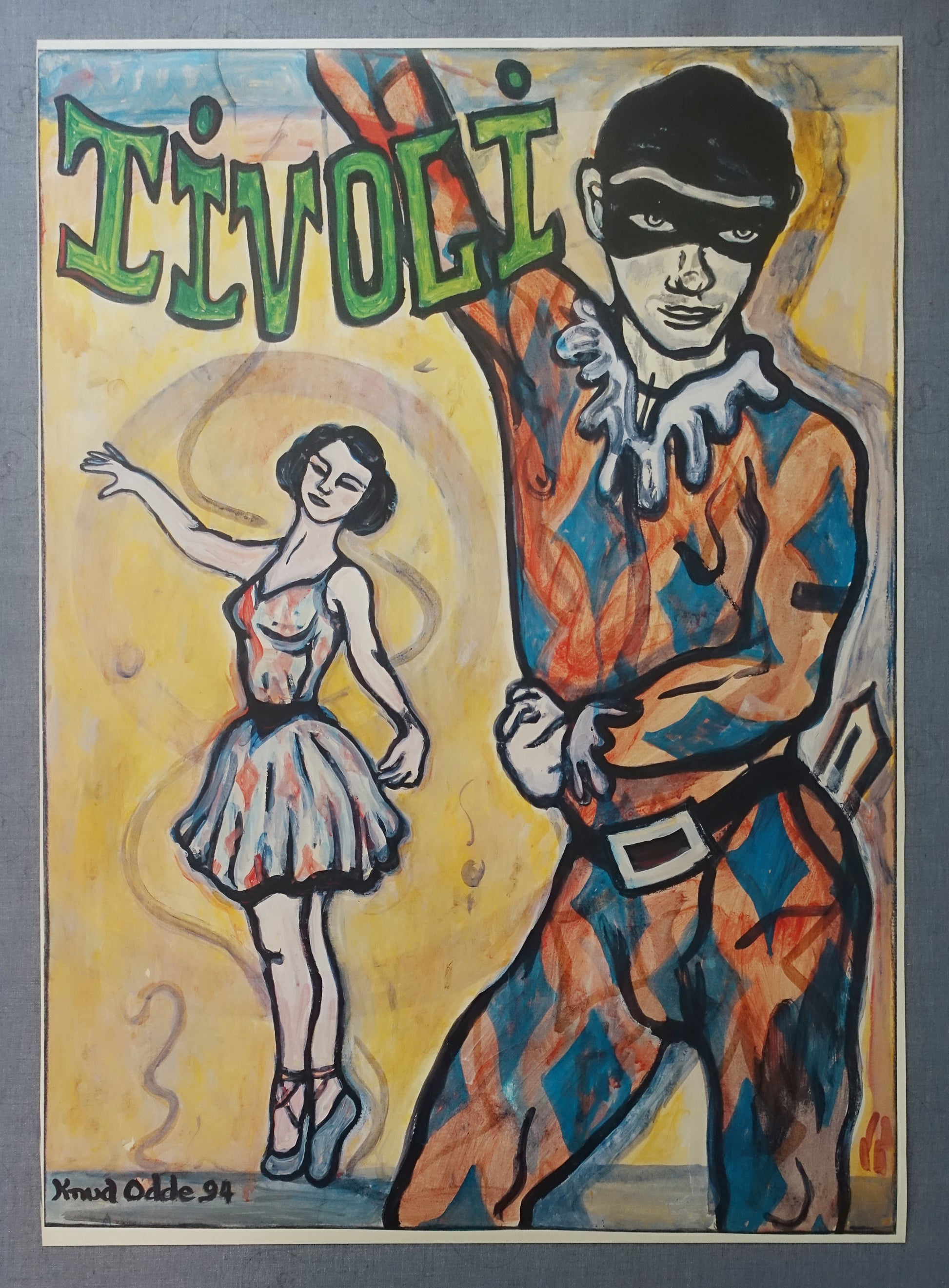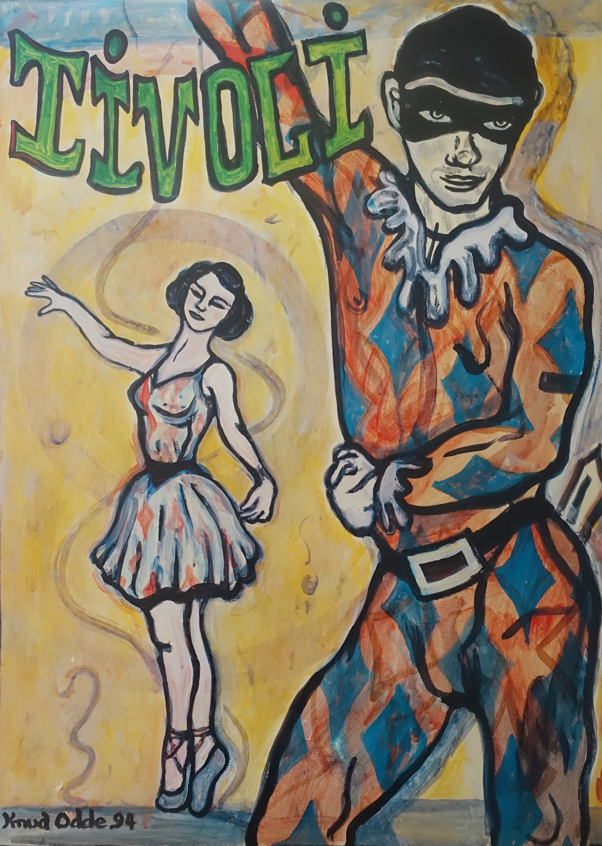 Every year Tivoli Amusement Park (or simply Tivoli) lets a Danish artist design the poster art for the coming season. The art for the poster of 1994 was created by Knud Odde (1955). Odde was trained librarian in 1978 and played in a punk group. As an artist he is self-taught and is operating with a strong symbolic language and an expressive form.
