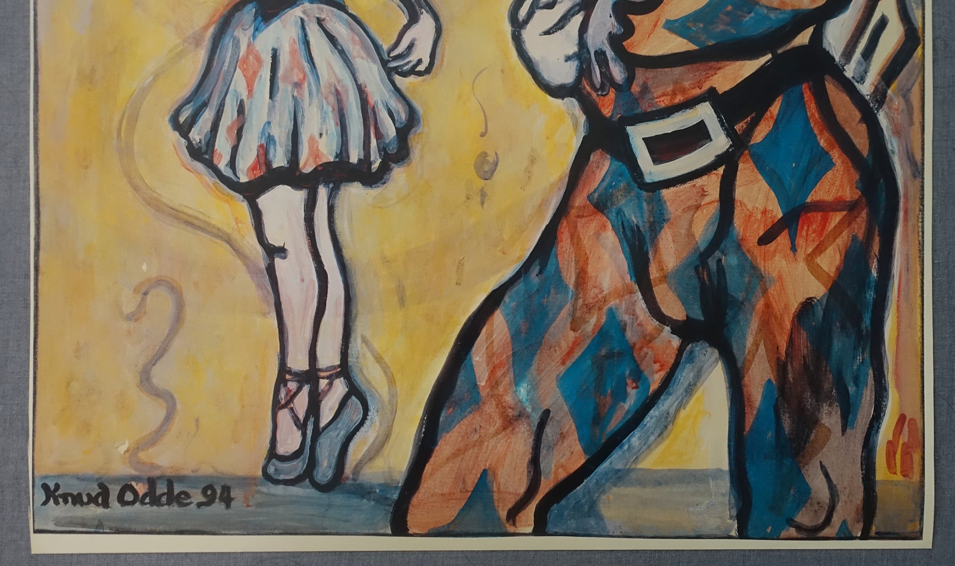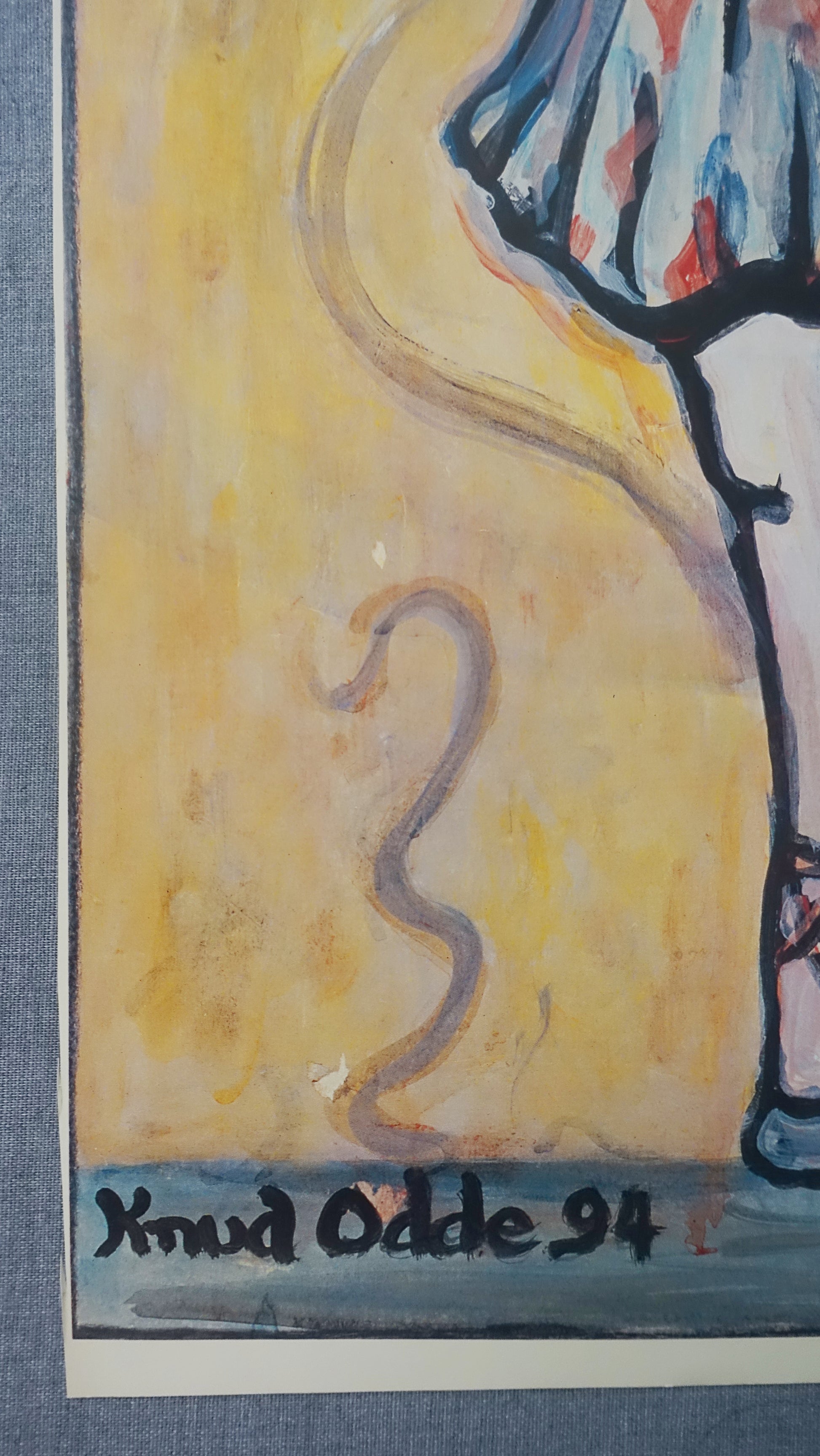 Many of Odde works have a very naturalistic character, almost cartoon-like expression. In his painting are often portraits of famous people, like Shirley MacLaine, Rainer Maria Rilke, Patti Smith and Miles Davis where the images with stark colors with knots and edges pointing in the direction of suppressed emotions and conflicts. With these images we also detect an inspiration from 1960s pop art of Andy Warhol, among others, however, were much more smoothly in the expression.