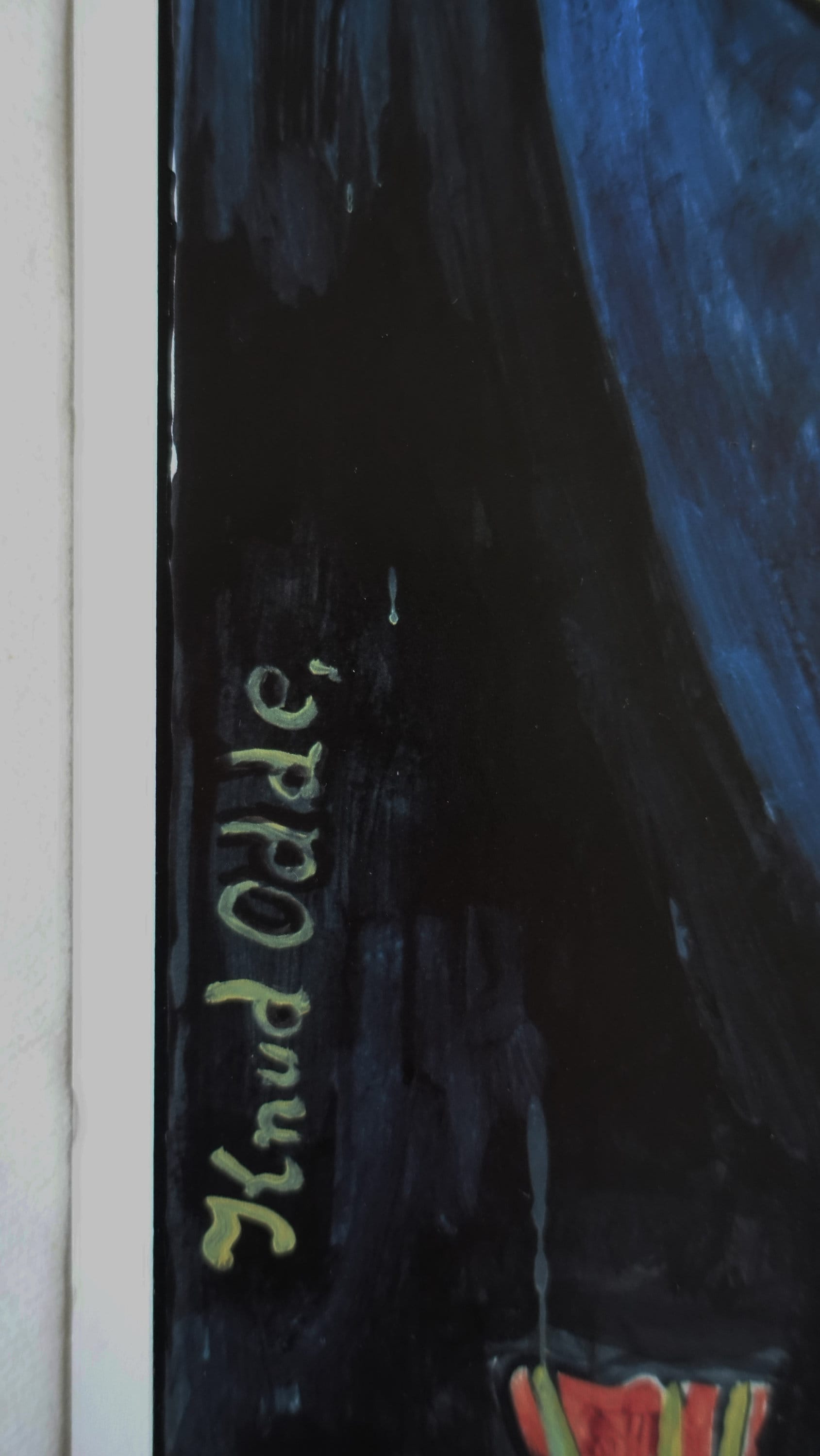 His portrait drawings of people and makes the person looks very characteristic and draws attention to the little details that makes the person look unique and thus adding life to the portraits. In fact, many of Odde works have a very naturalistic character, almost cartoon-like expression. In his painting are often portraits of famous people, like Shirley MacLaine, Rainer Maria Rilke, Patti Smith and Miles Davis where the images with stark colors with knots and edges pointing in the direction of suppressed emotions and conflicts. With these images we also detect an inspiration from 1960s pop art of Andy Warhol, among others, however, were much more smoothly in the expression.